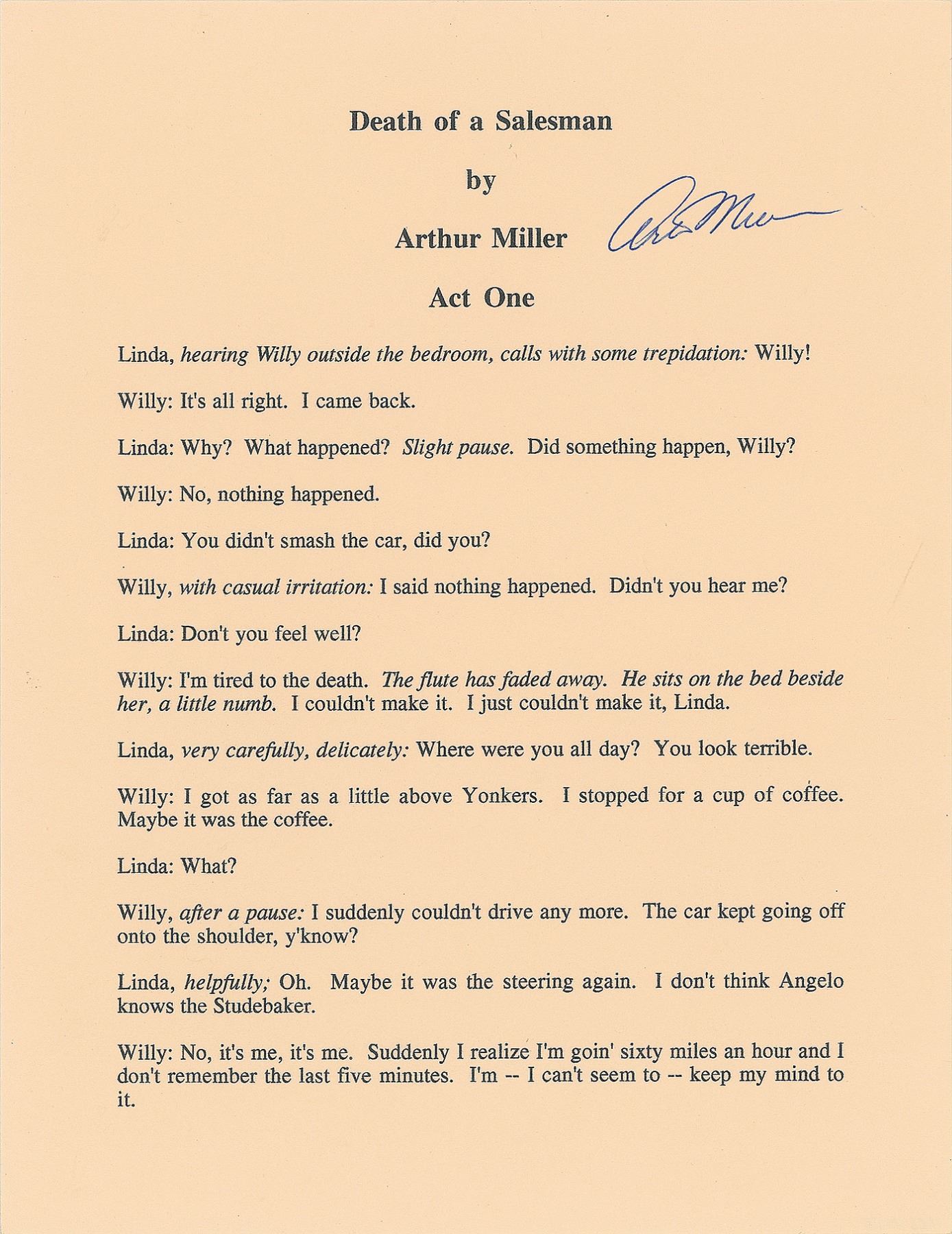 Souvenir typescript of the opening from Death of a Salesman, one page, 8.5 x 11, signed at the top in blue ballpoint by Miller. In part: "Linda, hearing Willy outside the bedroom, calls with some trepidation: Willy! / Willy: It’s all right. I came back. / Linda: Why? What happened? Slight pause. Did something happen, Willy? / Willy: No, nothing happened. / Linda: You didn’t smash the car, did you? / Willy,with casual irritation: I said nothing happened. Didn’t you hear me? / Linda: Don’t you feel well? / Willy: I’m tired to the death." In fine condition.