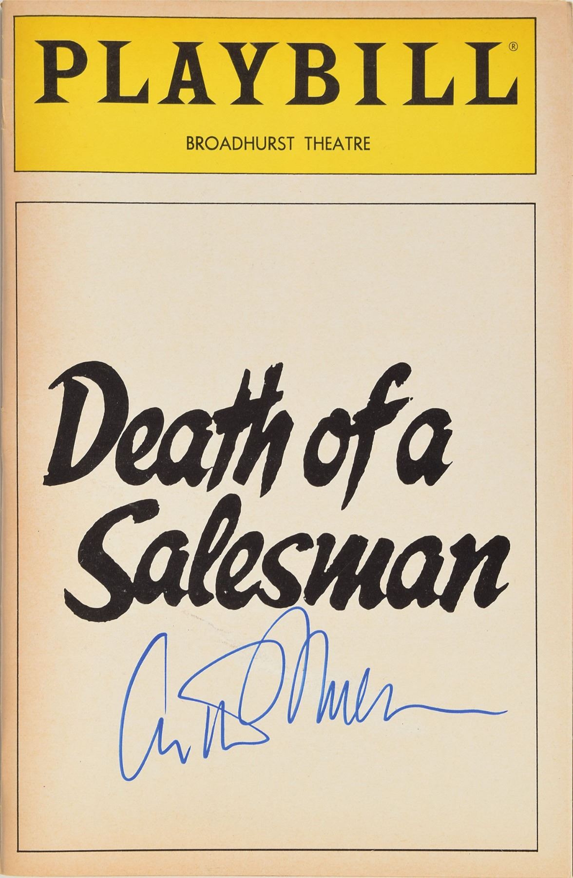 Playbill for Death of a Salesman at the Broadhurst Theatre in March 1984, Vol. 2, No. 6, 82 pages, 5.75 x 8.5, signed on the front cover in blue felt tip by Miller. In fine condition, with light edge toning. Originally obtained by in-person specialist Mike Wehrmann.