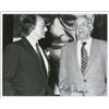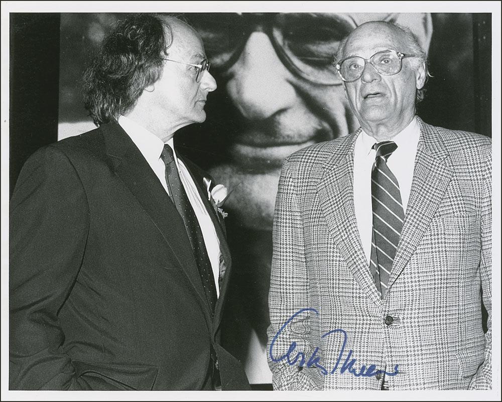 Glossy 10 x 8 photo of Miller speaking with the founder of the Ensemble Studio Theatre during a benefit, signed in blue felt tip, “Arthur Miller.” In fine condition.