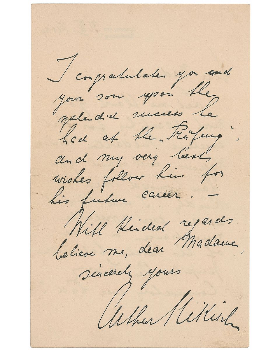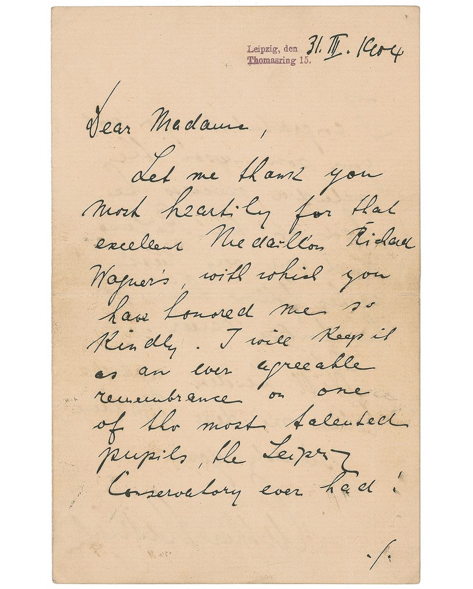 ALS, one page both sides, 4.5 x 7, March 31, 1904. Letter to a lady. In part: “Let me thank you heartily for that excellent medallion of Richard Wagner’s, with which you have honored me so kindly. I will keep it as an ever agreeable remembrance of one of the most talented pupils the Leipzig Conservatory ever had.” In fine condition, with slight show-through from writing to opposing sides. Originates from the collection of American violinist and pianist Louis Persinger (1887–1966), who trained at the Leipzig Conservatory and later taught at Juilliard, mentoring the likes of Yehudi Menuhin, Ruggiero Ricci, and Isaac Stern.
