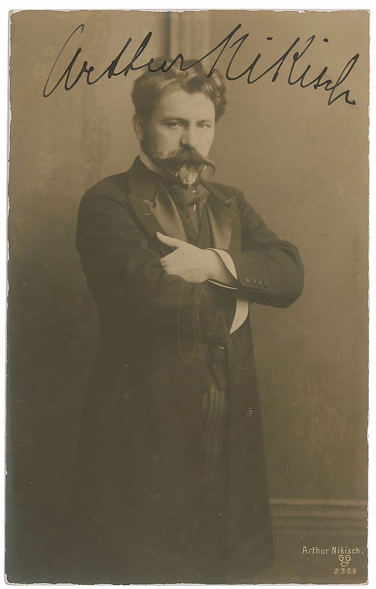 Internationally renowned Hungarian conductor (1855–1922). Vintage matte-finish 3.5 x 5.5 photo postcard of Nikisch with his arms crossed in a three-quarter-length pose, signed in black ink. In fine condition.