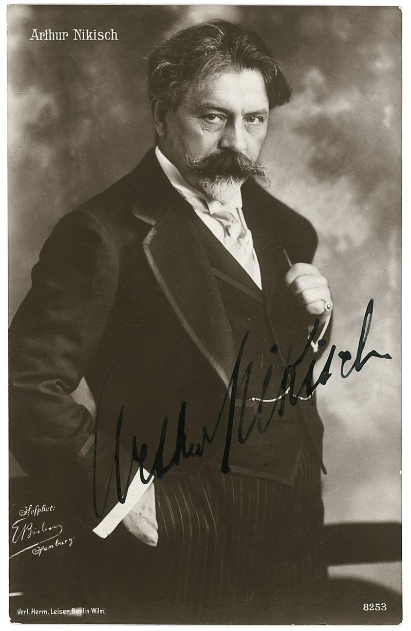 Hungarian conductor (1855-1922) who performed mainly in Germany. He was considered an outstanding interpreter of the music of Bruckner, Tchaikovsky, Beethoven, and Liszt. Vintage 3.5 x 5.5 German postcard photo, signed in fountain pen. In fine condition. RRAuction COA.