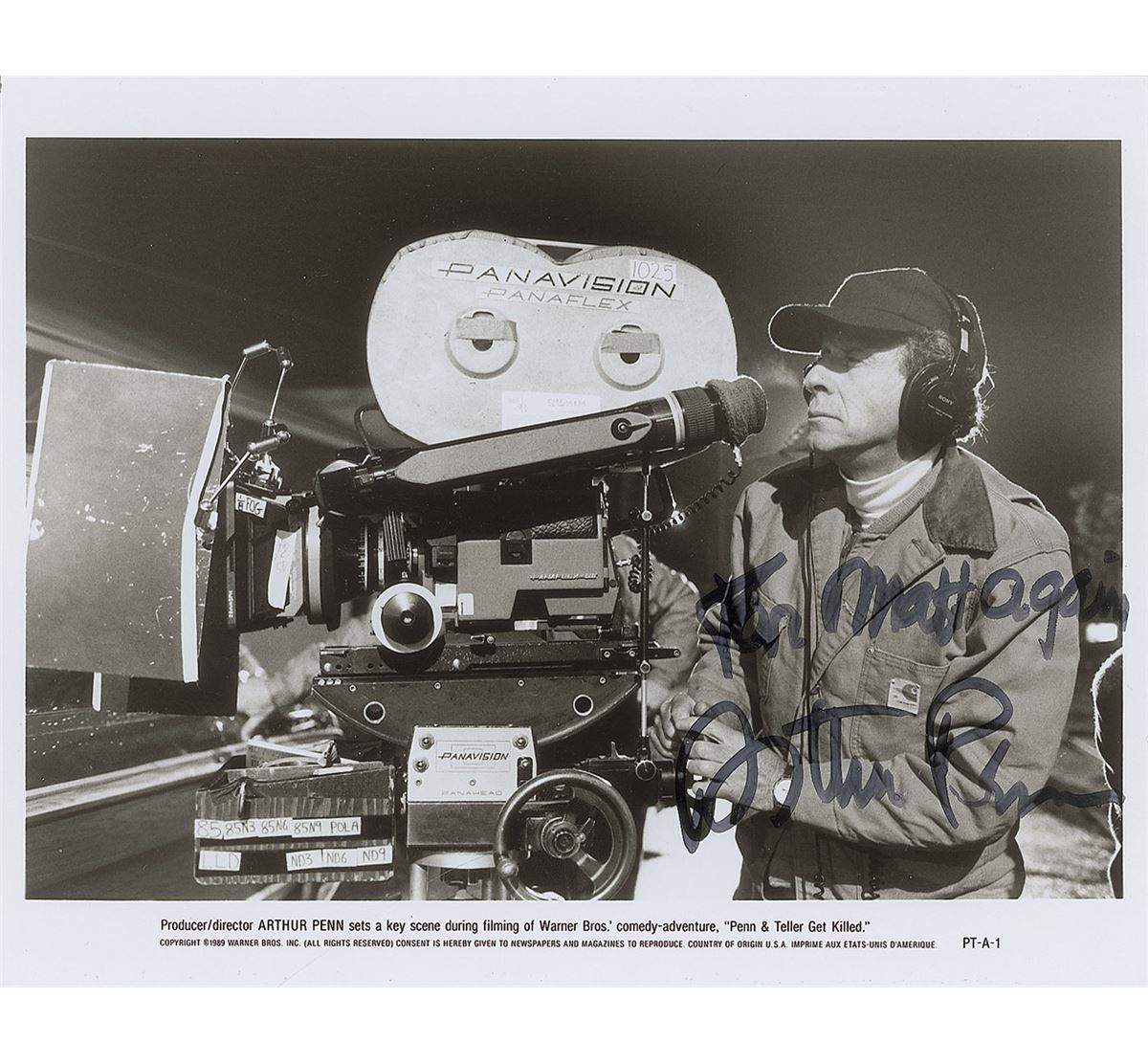 American director and producer (1922–2010) who earned critical acclaim for the films The Miracle Worker, Bonnie and Clyde, Alice's Restaurant, and Little Big Man. Two photos: a satin-finish 4 x 5 portrait of Penn, signed in the lower right in black ink; and a glossy 10 x 8 Warner Brothers publicity photo of Penn on the set of his 1989 film Penn & Teller Get Killed, humorously signed and inscribed in black felt tip, “For Matt again, Arthur Penn.” Reverse of the satin-finish bears a Paul Kolnik photography stamp. In overall fine condition. Accompanied by an original mailing envelope.