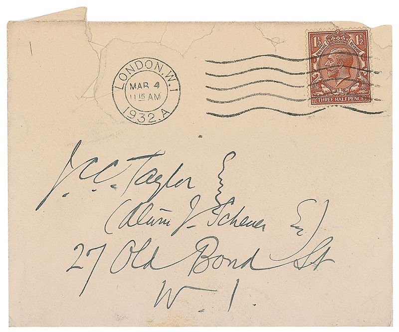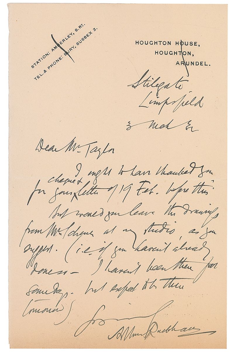 ALS, one page, 4.5 x 7, Houghton House letterhead, March 3, 1932. A letter to Mr. J. C. C. Taylor. In full: “I ought to have thanked you for your cheque & letter of 19 Feb. before this. But would you leave the drawings… at my studio as you suggest (i.e. if you haven’t already done so—I haven’t been there for some days, but expect to be there tomorrow).” In fine condition, with light toning to the bottom and some trivial ink mirroring. Accompanied by the original mailing envelope, filled out in Rackham’s hand.