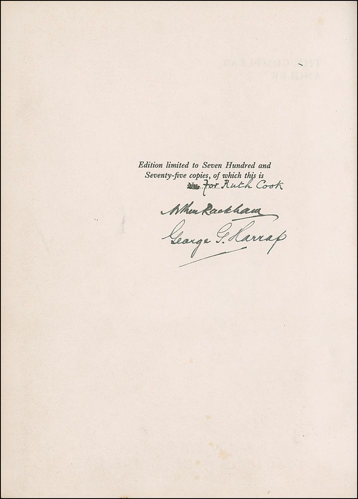 Signed book: The Compleat Angler by Izaak Walton. Limited edition of 775 copies. London: George G. Harrap & Co., Ltd., 1931. Hardcover, 8 x 10.5. Signed in fountain pen on the limitation page, “For Ruth Cook, Arthur Rackham” and “George G. Harrap.” In very good condition with some toning and mild soiling and staining, with mild soiling to the spine.
