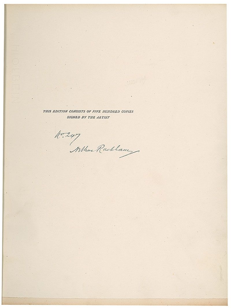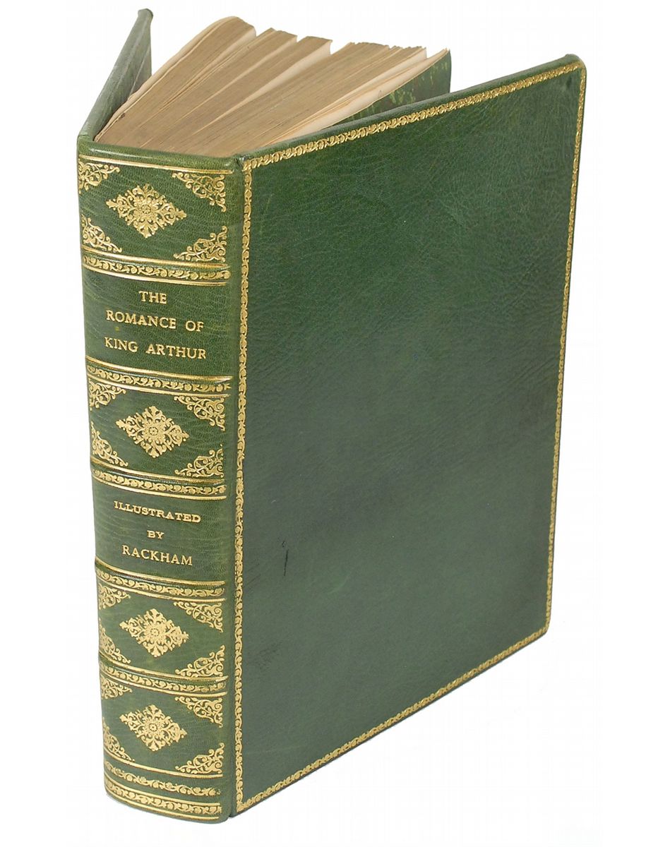 British artist and illustrator (1867–1939) best known for his Art Nouveau–influenced illustrations. Signed book: The Romance of King Arthur and the Knights of the Round Table. Limited edition of 500 copies (this being No. 247). London: Macmillan and Co., 1917. Hardcover, 9.25 x 11.25, 509 pages. Signed and numbered on the colophon in black ink by Rackham. Autographic condition: fine. Book condition: VG/None. Beautifully bound in green leather with gilt titles and decoration, gilted upper textblock edge, five raised bands to spine, and green marbled end-papers; minimal rubbing to edges; light bumps at upper corners; spine very slightly sunned; minor rubbing and soiling, with one small scuff to front; textblock edges yellowed; mild foxing scattered throughout; tiny expected tears to deckled textblock edges.