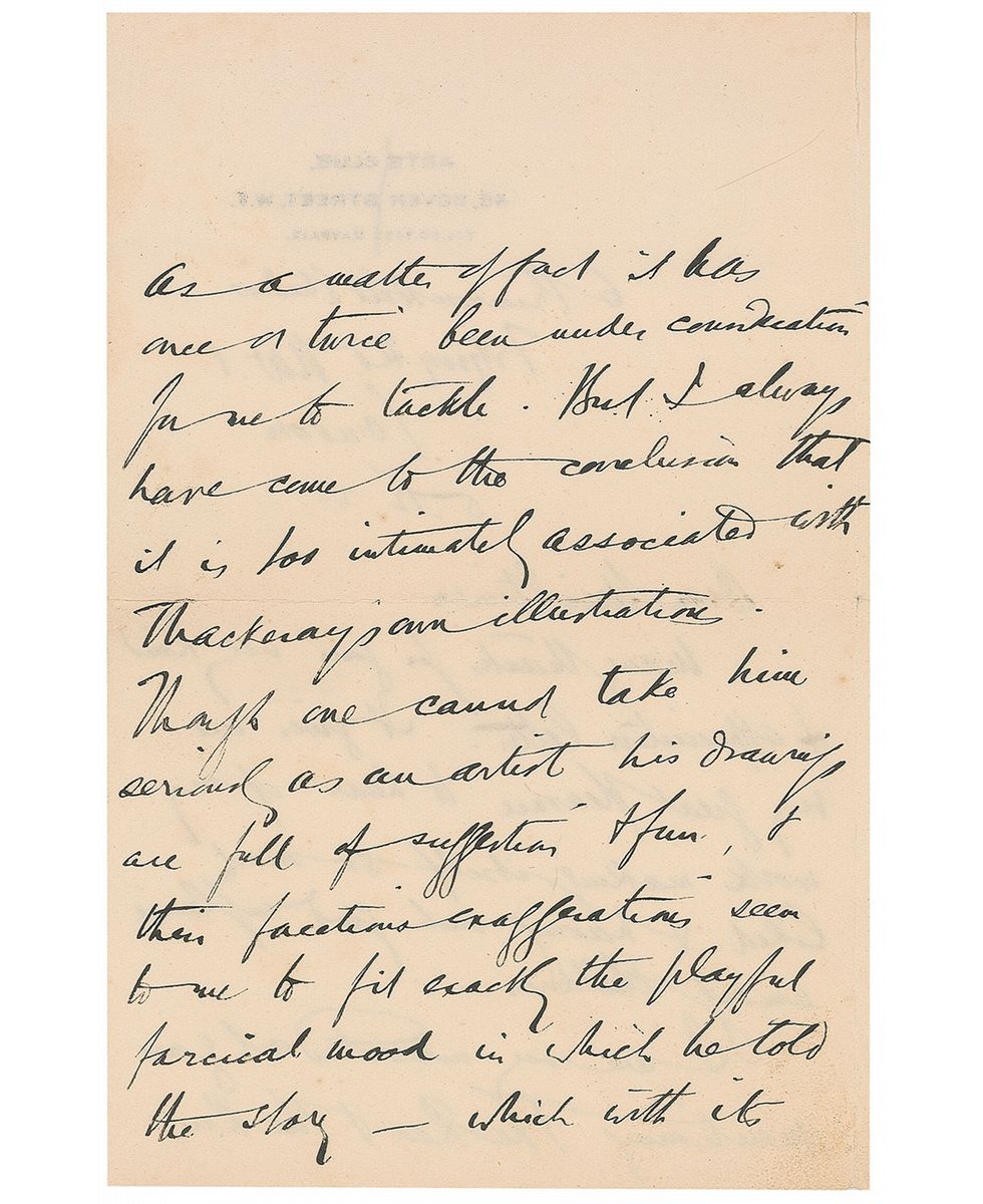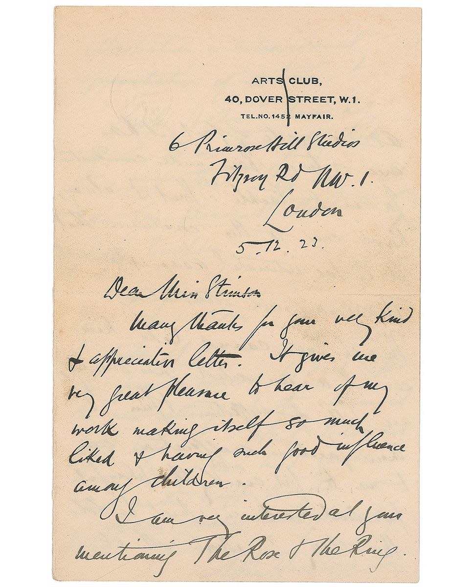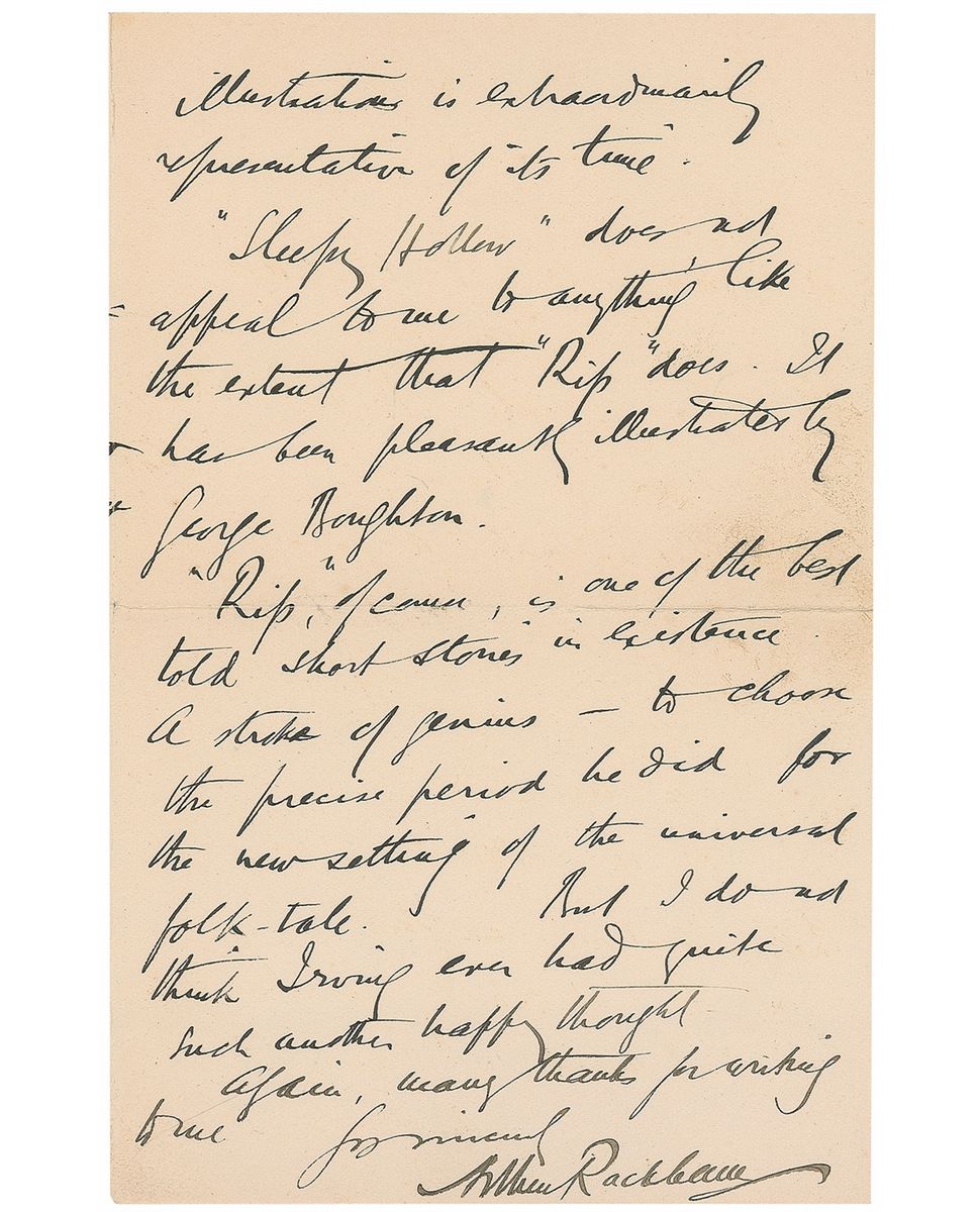 British artist and illustrator (1867–1939) best known for his Art Nouveau–influenced illustrations. ALS, three pages on two adjoining sheets, 4.5 x 7, Arts Club letterhead, May 12, 1923. Letter to Miss Stimson. In part: “I am very interested at your mentioning The Rose & the Ring as a matter of fact it has once or twice been under consideration for me to tackle. But I always have come to the conclusion that it was intimately associated with Thackeray’s own illustration…‘Sleepy Hollow’ does not appeal to me to anything like the extent that ‘Rip’ does. It has been pleasantly illustrated by George Boughton. ‘Rip,’ of course, is one of the best told short stories in existence. A stroke of genius—to choose the precise period he did for the new setting of the universal folk tale. But I do not think Irving ever had quite such another happy thought.” In fine condition, with partial separations along central horizontal fold. Accompanied by the original mailing envelope addressed in Rackham’s hand.