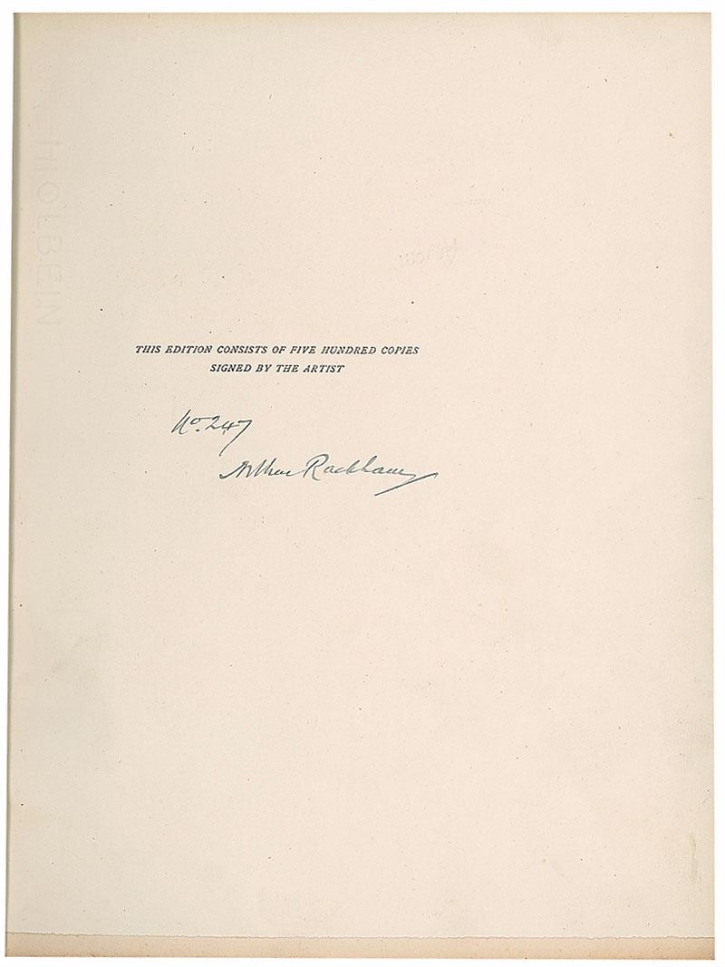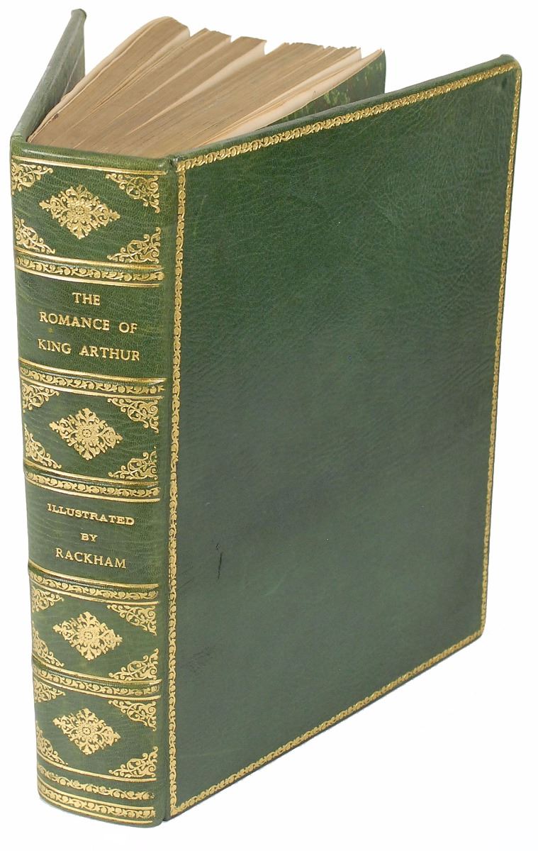 British artist and illustrator (1867–1939) best known for his Art Nouveau–influenced illustrations. Signed book: The Romance of King Arthur and the Knights of the Round Table. Limited edition of 500 copies (this being No. 247). London: Macmillan and Co., 1917. Hardcover, 9.25 x 11.25, 509 pages. Signed and numbered on the colophon in black ink by Rackham. Autographic condition: fine. Book condition: VG/None.