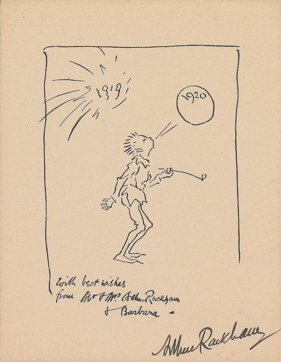 British artist and illustrator (1867–1939) best known for his Art Nouveau–influenced illustrations. Print of Rackham’s sketch celebrating the 1920 new year on an off-white 3.5 x 4.5 card, boldly signed in the lower right corner in black ink. In fine condition.
