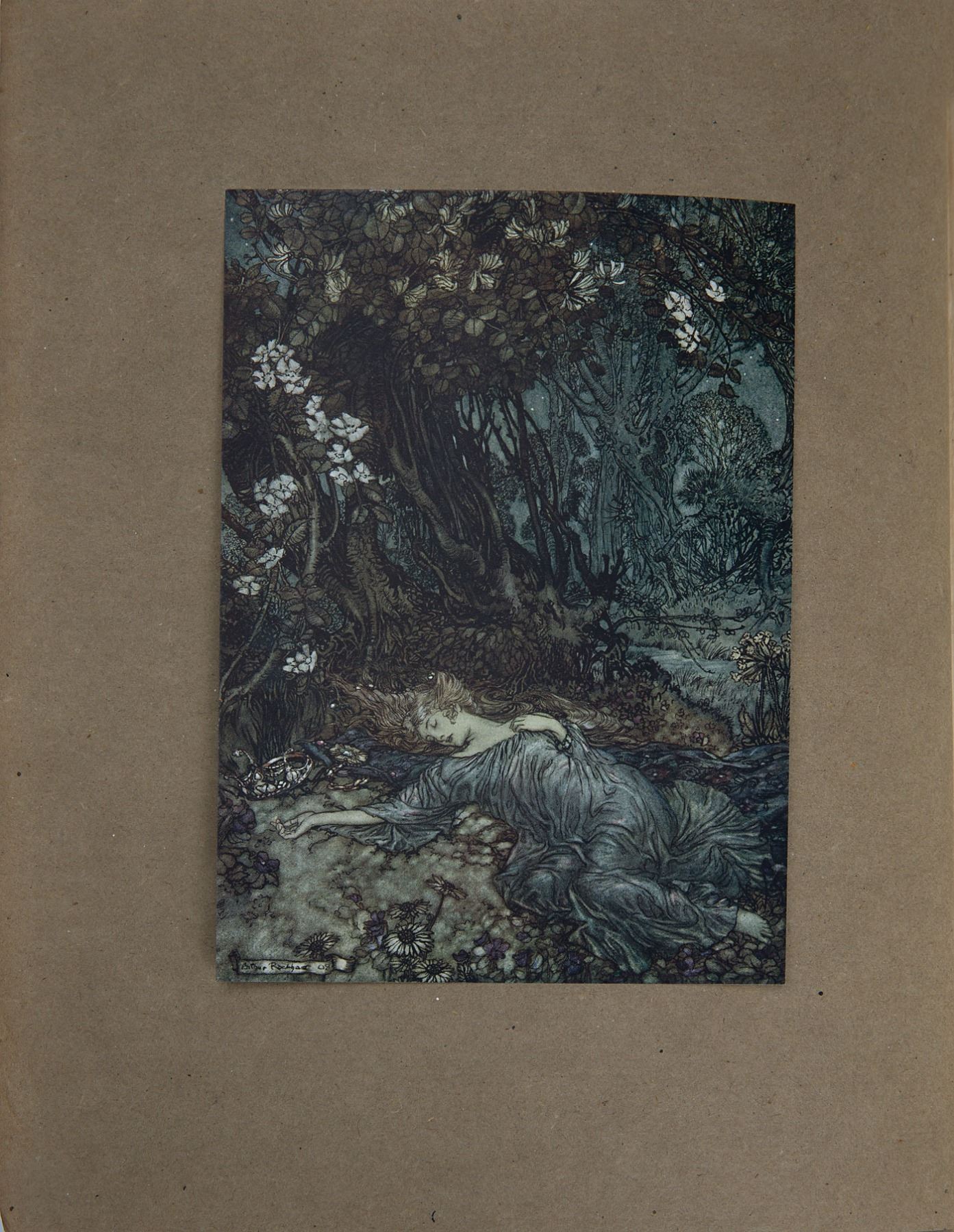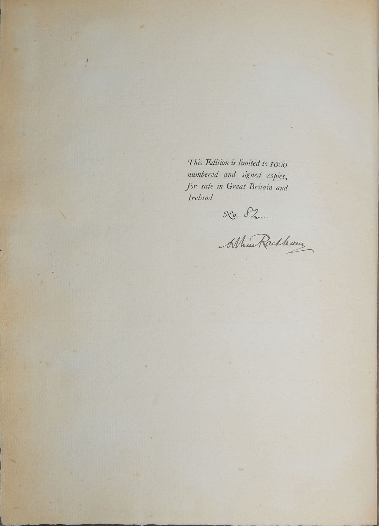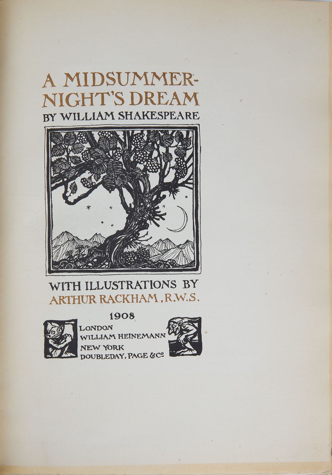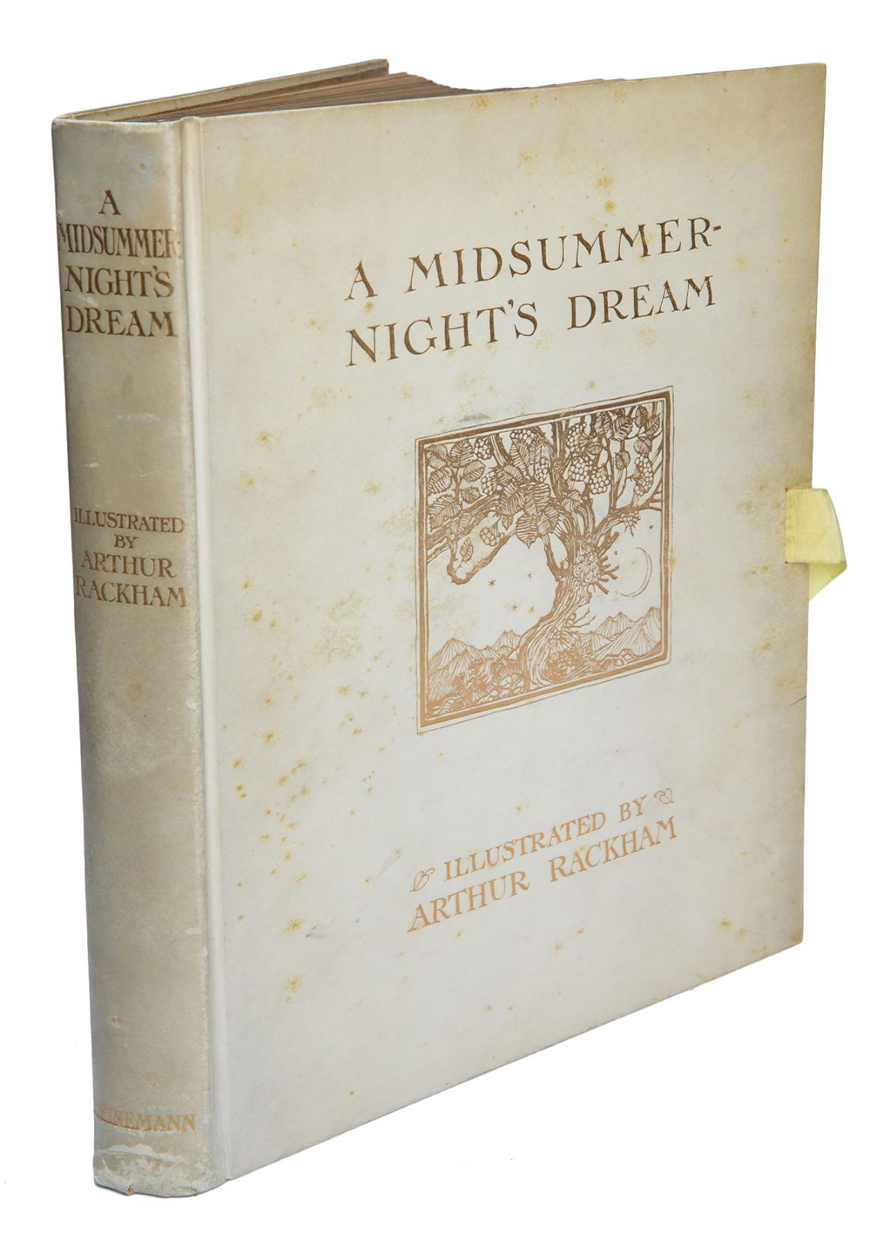 Signed book: A Midsummer-Night's Dream. First edition, limited issue, numbered 82/1000. London: William Heinemann, 1908. Hardcover in original full vellum, titles and pictorial decoration to spine and image blocked in gilt to front board and top edge gilt, others untrimmed, silk yellow ribbon ties, 9.5 x 11.75, 134 pages. Signed on the colophon in ink, "Arthur Rackham." The gorgeous volume features 40 tipped-in color plates of Rackham's artwork, along with numerous black-and-white illustrations adorning the text of William Shakespeare's famous play. Autographic condition: fine, with light toning to perimeter. Book condition: VG/None, with foxing to boards, and a bookplate affixed to the front pastedown. A sought-after edition of a classic work.
