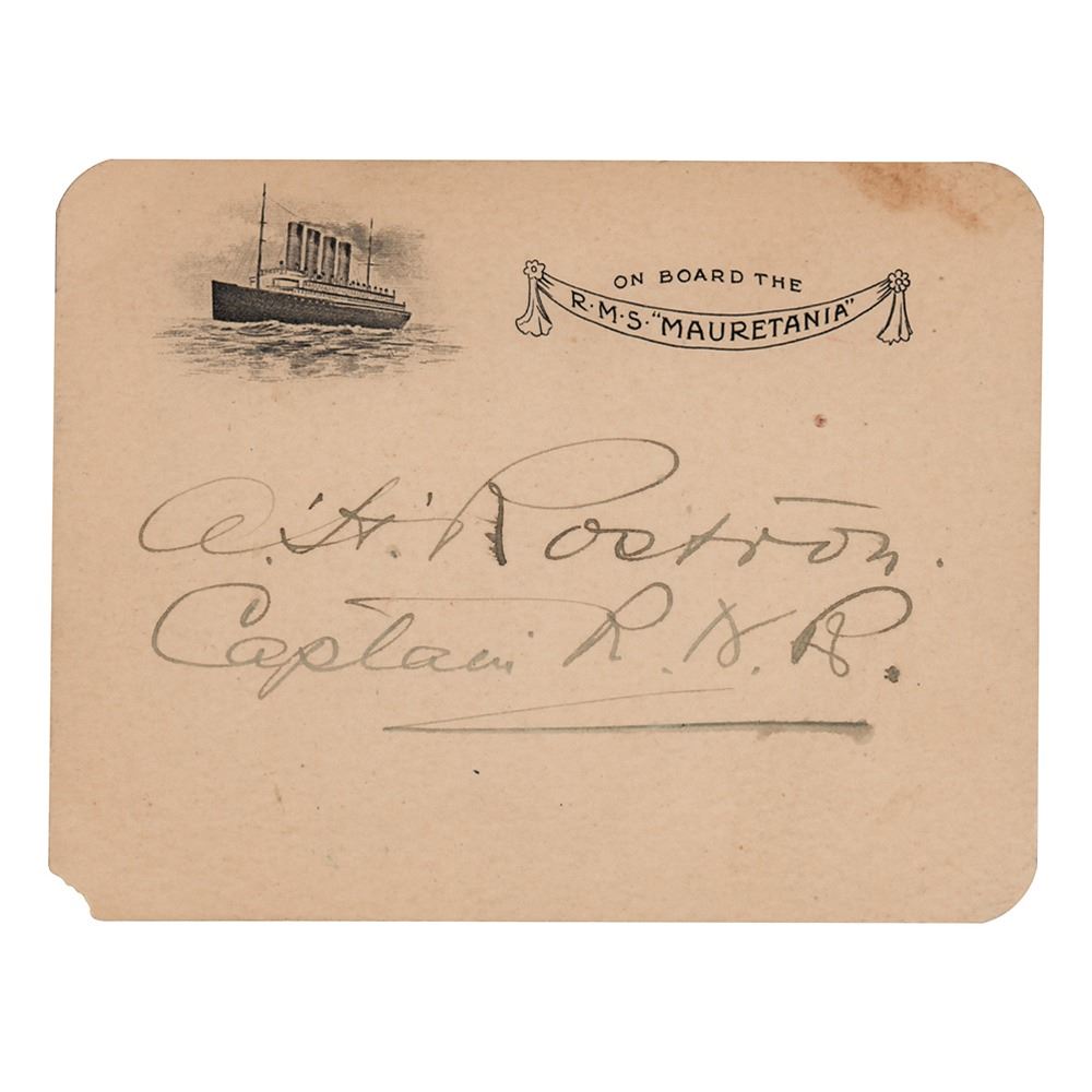 Captain of the Carpathia (1869–1940) responsible for rescuing Titanic survivors on the morning of April 15, 1912. Vintage ink signature, "A: H: Rostron, Captain RNR,” on an off-white 4.5 x 3.5 engraved "On Board the RMS 'Mauretania" card. In fine condition, with a small stain to the upper right corner, and trivial loss to the lower left corner tip. Accompanied by an unsigned glossy photo.
