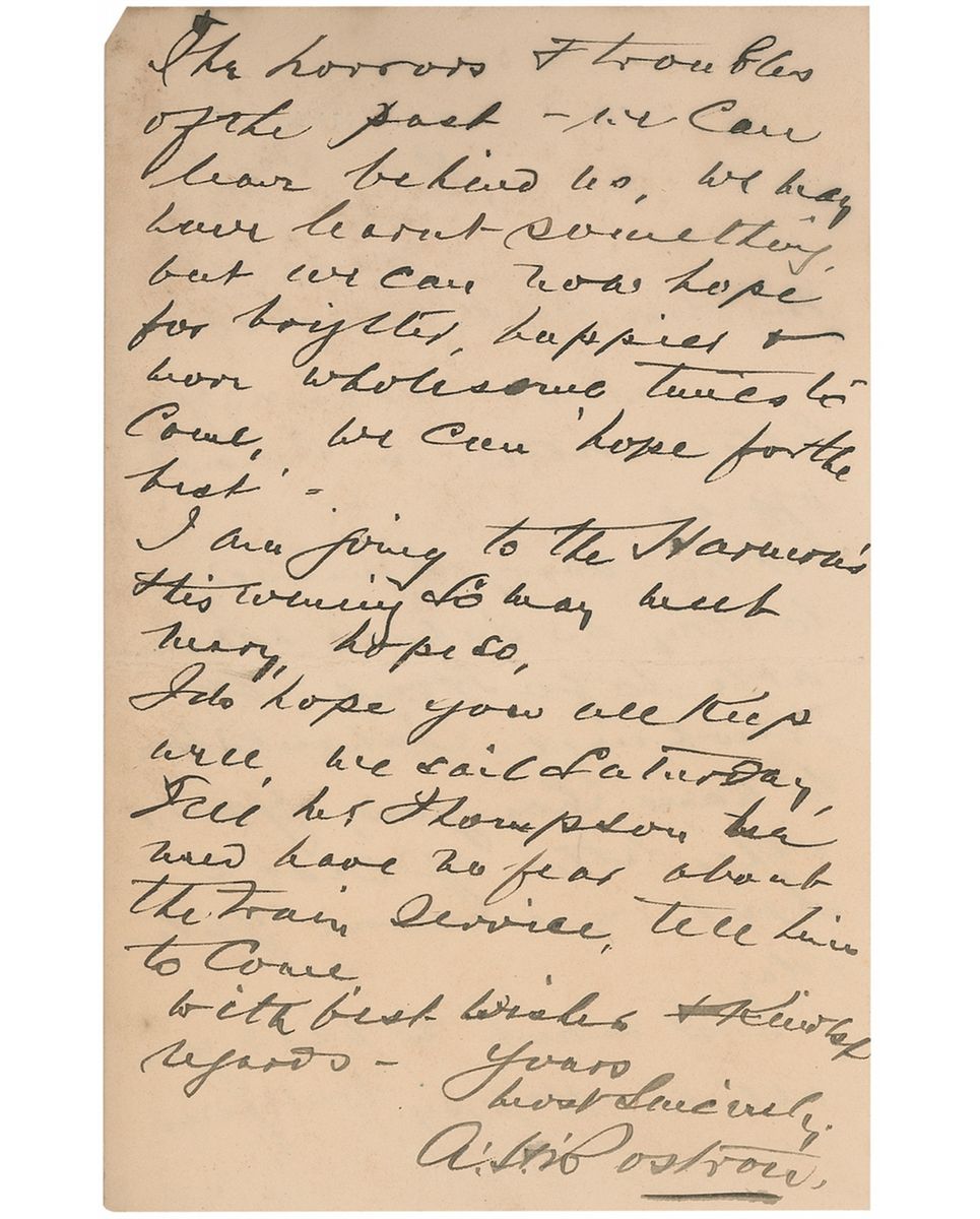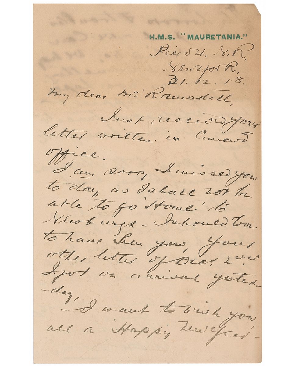 Captain of the Carpathia (1869–1940) responsible for rescuing Titanic survivors on the morning of April 15, 1912. Honored for his humanitarianism, Rostron was knighted by George V and became the only Englishman to receive the Congressional Medal of Honor presented to him by President William Taft. Uncommon ALS signed “A. H. Rostron,” one page both sides, 4.25 x 7, H.M.S. Mauretania letterhead, December 31, 1918. Letter to Mr. Ramsdell. In full: “Just received your letter written in Cunard office. I am sorry I missed you to day as I shall not be able to go ‘Home’ to Newburgh. I should love to have seen you, your other letter of Dec. 2nd I got on arrival yesterday. I want to wish you all ‘Happy New Year.’ The horrors & troubles of the past—we can leave behind us. We may have learnt something, but we can now hope for brighter, happier & more wholesome times to come. We can hope for the best. I am going to the Harnera’s this evening so may meet Mary, hope so. I do hope you all keep well. We sail Saturday. Tell Mr. Thompson he need have no fear about the train service, tell him to come.” In very good condition, with scattered toning and soiling, a bit heavier to the edges, and upper portion of front. An optimisitc offering from the understated hero of the Titanic disaster written just six weeks after the end of World War I.