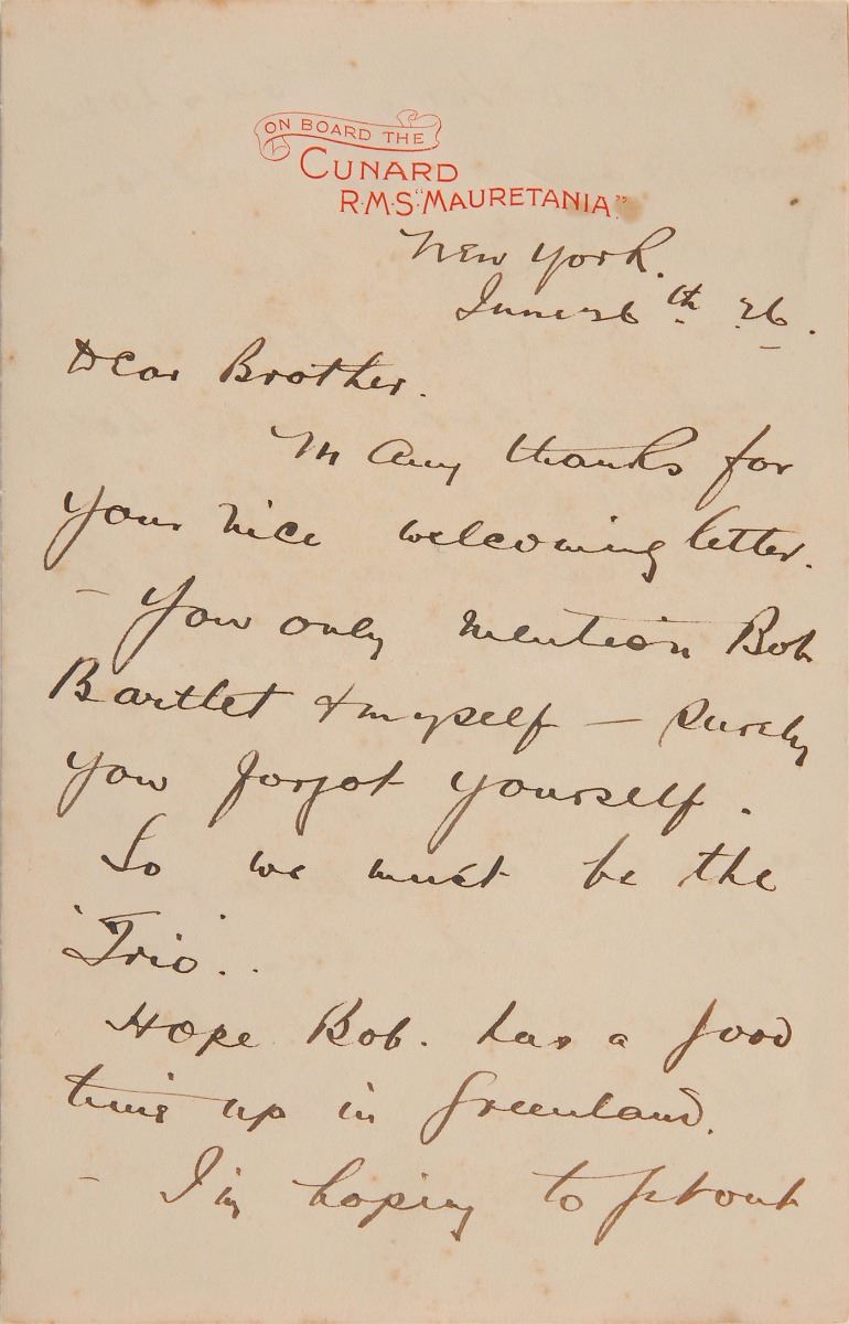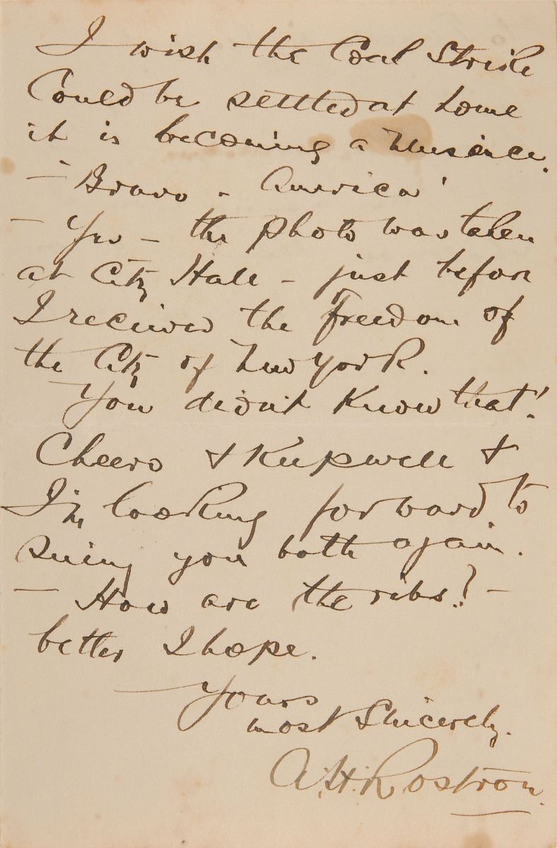 Captain of the Carpathia (1869–1940) responsible for rescuing Titanic survivors on the morning of April 15, 1912. ALS signed “A. H. Rostron,” four pages on two adjoining sheets, 4.5 x 7, Cunard Line, RMS Mauritania letterhead, June 26, 1926. Letter to his friend Louis Ogden, a New York socialite who was aboard the RMS Carpathia during the Titanic disaster and who helped to photograph, document, and assist the survivors. In part: “Many thanks for your nice welcoming letter. You only mention Bob Bartlett and myself—surely you forgot yourself. So we must be the ‘Trio.’ Hope Bob has a good time up in Greenland. I'm hoping to go out to Tuxedo in August. You'll have a jolly luncheon party I know & I can assure you I shall be thinking of you…I’m sorry to say Mrs. Rostron was none too grand when at home last time. She had been unwell and the maid put a hot water bottle to her feet—either it was too hot or it leaked. At any rate—she had a badly scalded leg & foot. Poor girl—it looked awful and was painful too. She was getting better when I left…I wish the coal strike could be settled at home it is becoming a nuisance—’Bravo in America’—Yes—The photo was taken at City Hall—just before I received the Freedom of the City of New York. You didn’t know that!” In very good to fine condition, with some scattered staining.