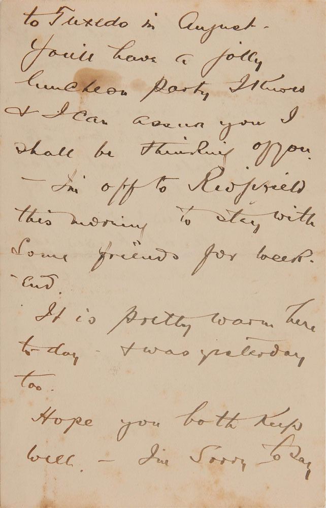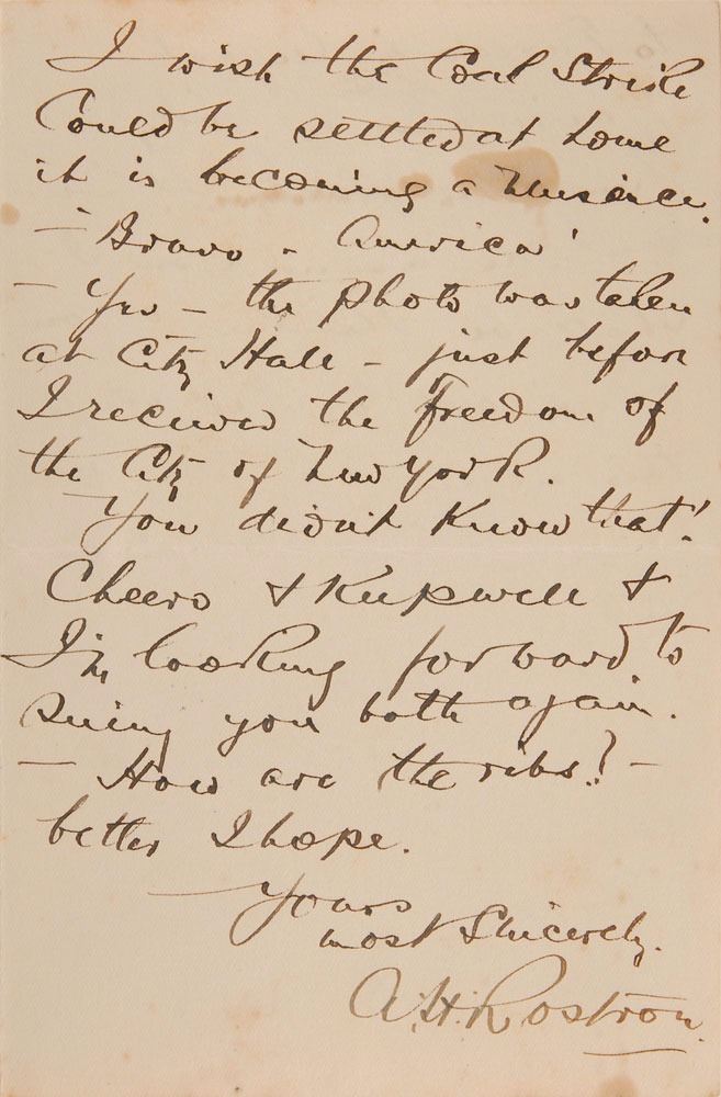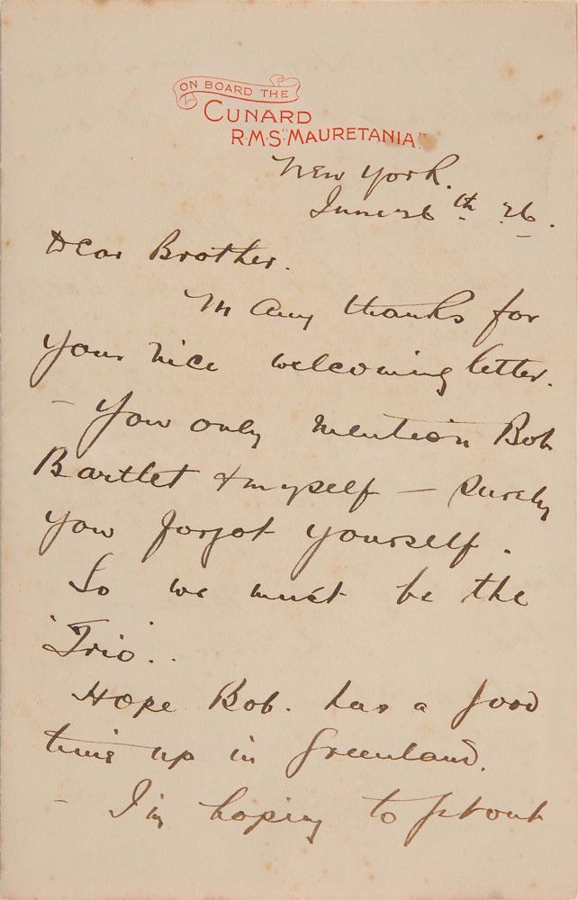 Captain of the Carpathia (1869–1940) responsible for rescuing Titanic survivors on the morning of April 15, 1912. Rare ALS signed “A. H. Rostron,” four pages on two adjoining sheets, 4.5 x 7, Cunard Line, RMS Mauritania letterhead, June 26, 1926. Letter to his friend Louis Ogden, a New York socialite who was aboard the RMS Carpathia during the Titanic disaster and who helped to photograph, document, and assist the survivors. In part: “Many thanks for your nice welcoming letter. You only mention Bob Bartlett and myself—surely you forgot yourself. So we must be the ‘Trio.’ Hope Bob has a good time up in Greenland. I'm hoping to go out to Tuxedo in August. You'll have a jolly luncheon party I know & I can assure you I shall be thinking of you…I’m sorry to say Mrs. Rostron was none too grand when at home last time. She had been unwell and the maid put a hot water bottle to her feet—either it was too hot or it leaked. At any rate—she had a badly scalded leg & foot. Poor girl—it looked awful and was painful too. She was getting better when I left…I wish the coal strike could be settled at home it is becoming a nuisance—’Bravo in America’—Yes—The photo was taken at City Hall—just before I received the Freedom of the City of New York. You didn’t know that!” In very good to fine condition, with some scattered staining. Rostron was bestowed the ‘Freedom of the City of New York’ in June 1926 for his ’splendid service to humanity and to the City of New York and the people of the United States over many years.’