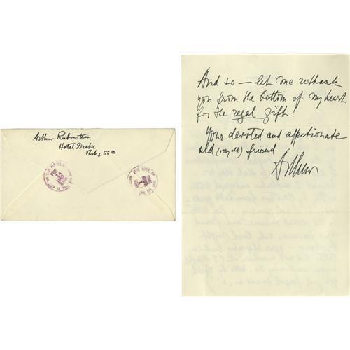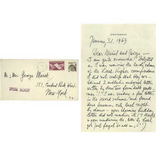 <B> Arthur Rubinstein Autograph Letter Signed </B></I> "<I>Arthur.</B></I>" Two pages, 7.25" x 10.5", personal letterhead, New York, New York, January 3, 1969. Written to Mariel and George Marek; the letter reads in part, "<I>…I am quite overcome!! Delighted as I was receiving the lovely volumes of the Liszt-Wagner correspondence I did not realize that they contained 2 authentic autograph letters written by these two formidable gentlemen!!!...</B></I>" Rubinstein himself was no slouch either; he was a piano virtuoso, who was known for his performances of Chopin and other difficult compositions. <BR><BR> The letter is in very fine condition; usual folds are present. Included in this lot is the original envelope in which the letter was sent.