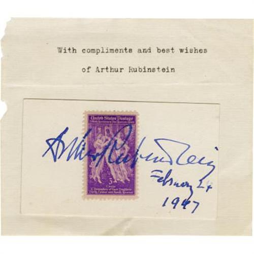 <B>Arthur Rubinstein Autograph.</B></I> A 3.5" x 2" card, with a 1940 three-cent postage stamp affixed, autographed by Arthur Rubinstein and dated by the virtuoso pianist February 24, 1947. Rubinstein's signature spans across the face of the stamp and is in blue ink. The card itself is affixed to a larger piece (4.5" x 4") with Rubinstein's best wishes typed across the top border. In Very Fine condition with mild wrinkling, age-toning, and a small chip to the larger paper along left border.<BR><BR><b>Shipping:</b> Flat Material, Small (<a target="_blank" href="http://www.heritageauctions.com/common/shipping.php">view shipping information</a>)