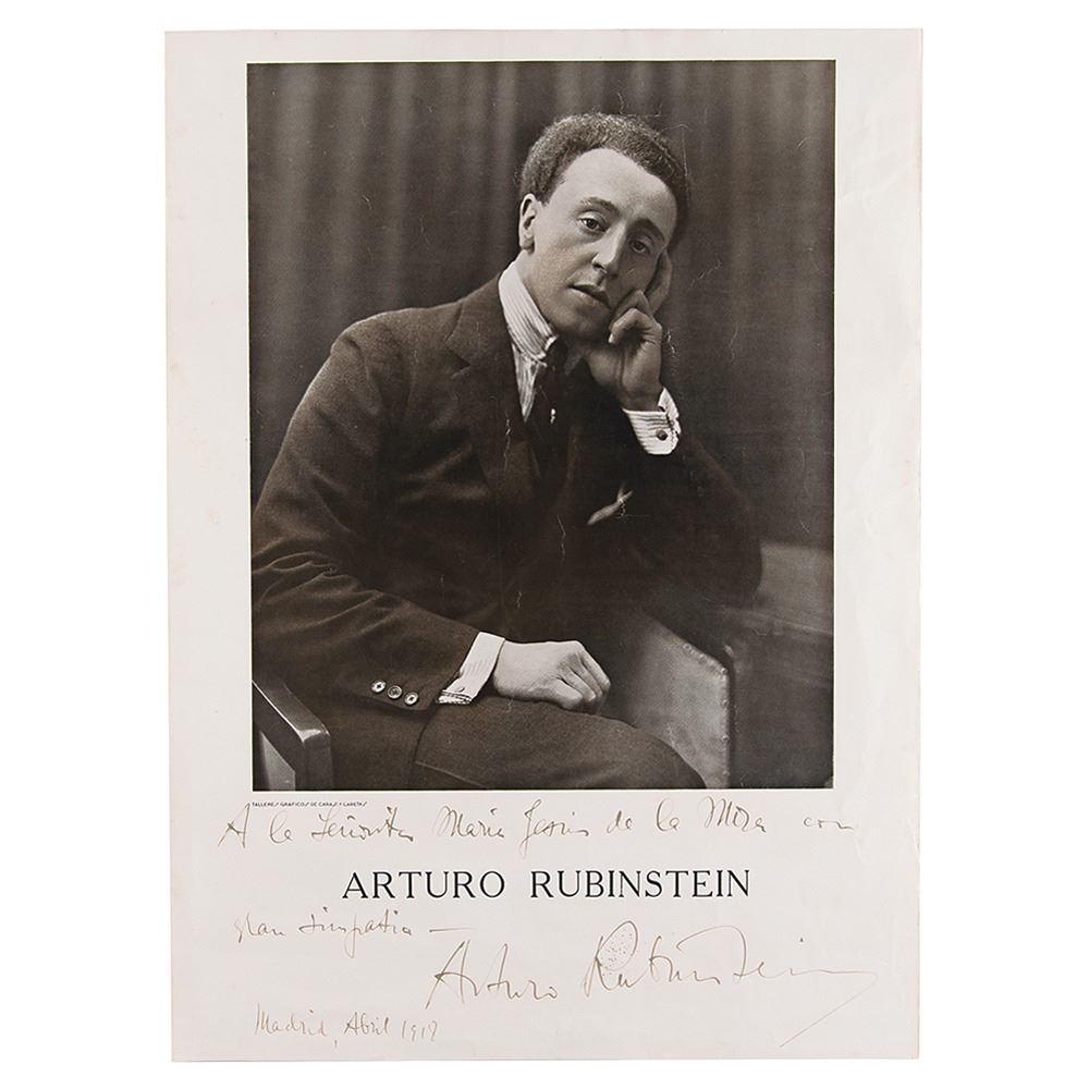 Piano virtuoso (1887–1982) best known for his interpretations of Chopin. Original 14.5 x 20 poster of Rubinstein in a handsome seated pose, published by Talleres Graficos de Caras y Caretas, signed and inscribed in the lower border in fountain pen, and dated at Madrid, April 1918. In very good condition, with overall creasing and speckled ink blots at the start of his surname. A wonderful oversized piece prominently signed by the virtuoso.
