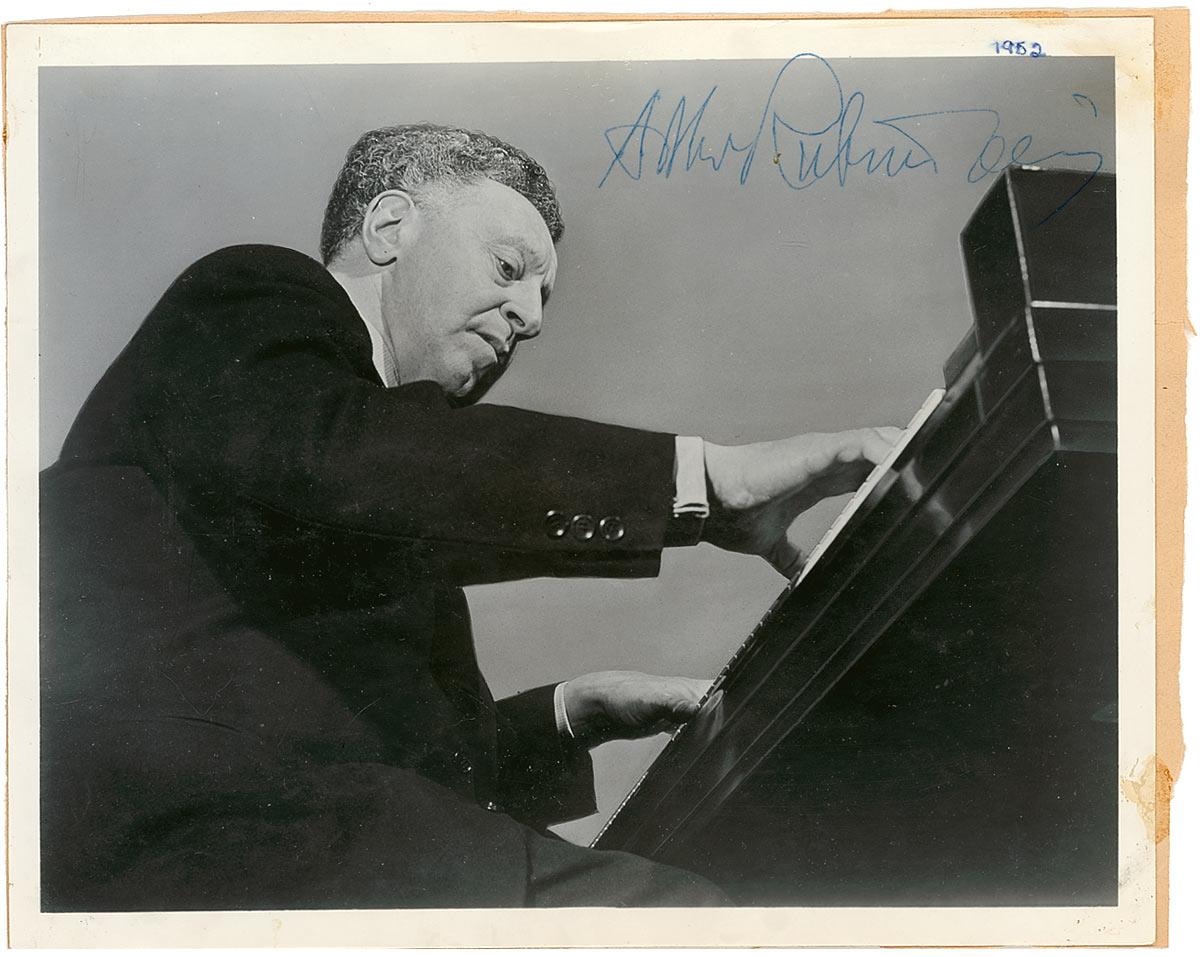 Vintage glossy 10 x 8 photo of Rubinstein, signed in blue ballpoint. Photo is affixed to a slightly larger scrapbook page, with a signed glossy 8 x 10 photo of Jan Peerce affixed to the reverse. In very good condition, with mild rippling from adhesive on reverse, as well as some glue remnants and surface impressions.