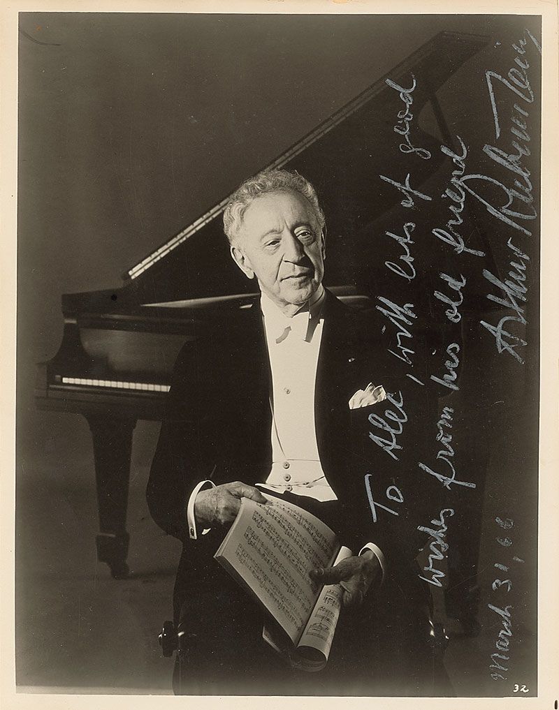 Glossy 8 x 10 photo, signed and inscribed vertically in white artist’s pencil, “To Alec, with lots of good wishes from his old friend, Arthur Rubinstein, March 31, ’66.” In fine condition.