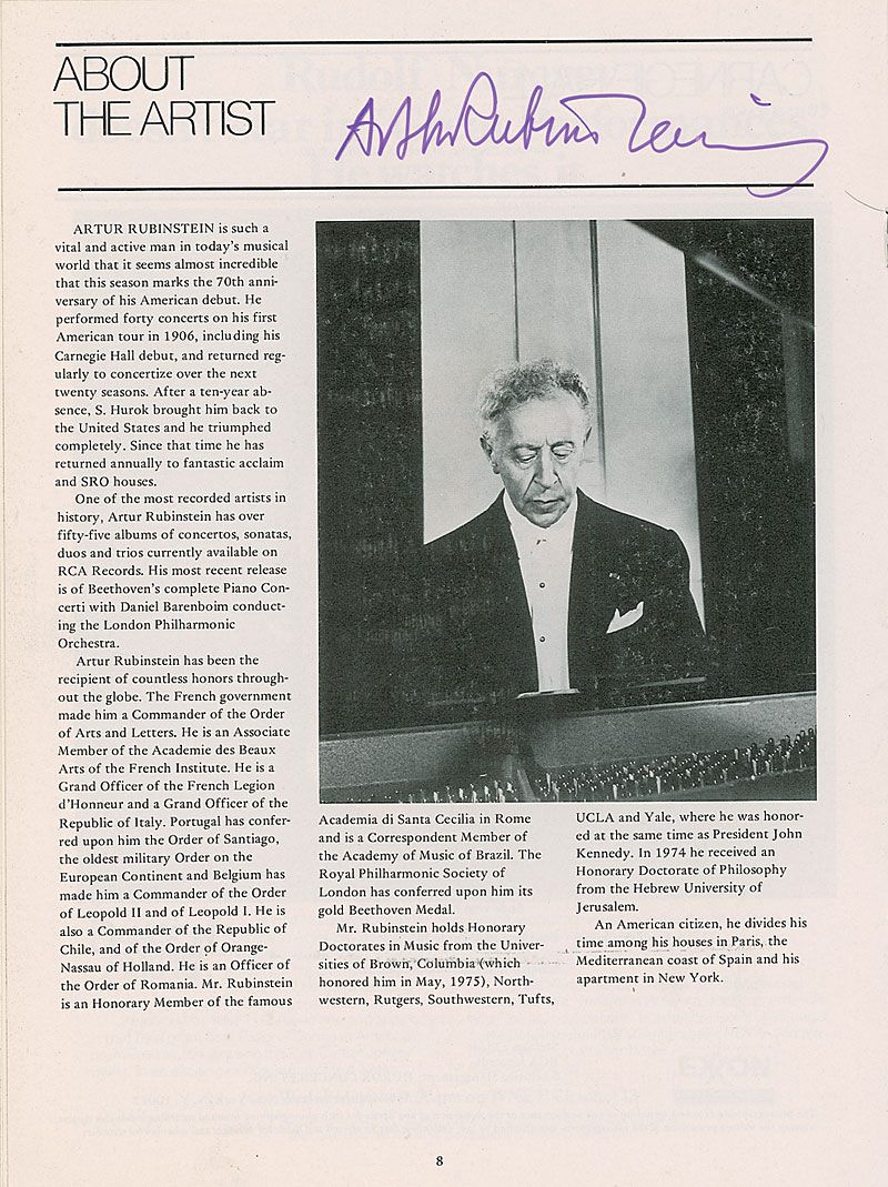 Piano virtuoso known especially for his interpretations of Chopin (1887–1982). Uncommon program for Rubinstein’s concert at Carnegie Hall on March 15, 1976, 8.25 x 11, 16 pages, signed on the about the artist page in purple felt tip. In fine condition.