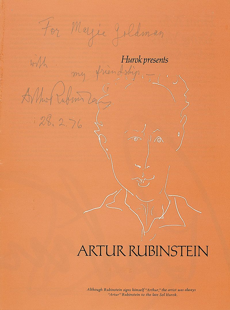 Program from a Rubinstein concert presented by Hurok, 9 x 12, 23 pages, signed and inscribed on the first page in black ballpoint, “For Margie Goldman, with my friendship—Arthur Rubinstein, 28.2.76.” In fine condition.