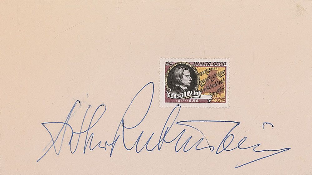 Ballpoint signature, “Arthur Rubinstein,” on an off-white 6.5 x 3.5 mailing envelope with a Franz Liszt Russian postage stamp affixed above signature. In fine condition.