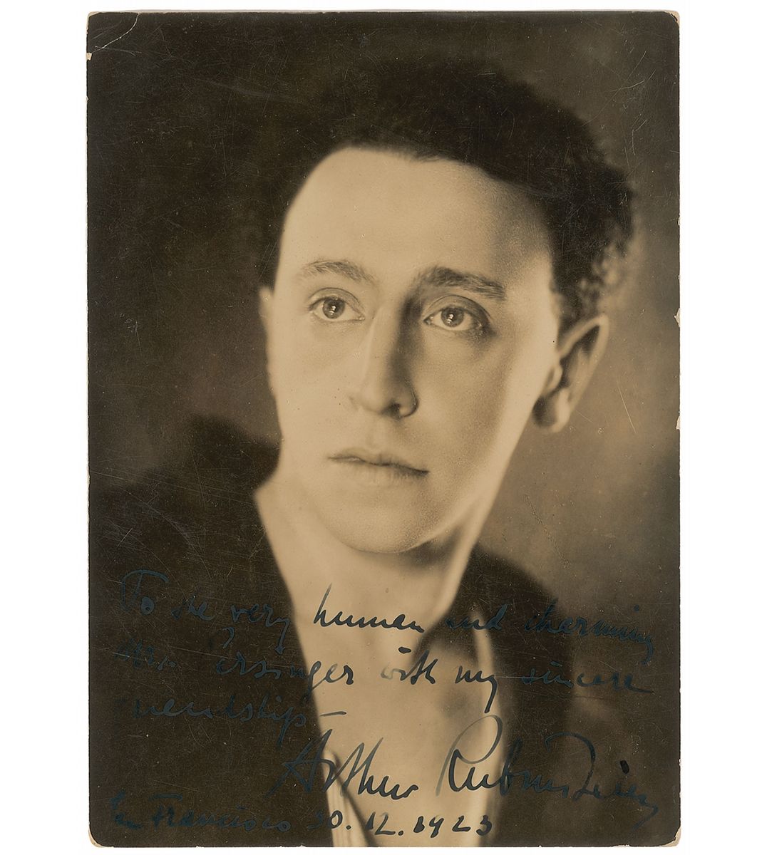 Polish-American classical pianist (1887–1982) considered by many the greatest Chopin interpreter of his time. Fabulous early pearl-finish 5 x 7 photo, signed and inscribed in black ink “To the very human and charming Mr. Persinger with my sincere friendship—Arthur Rubinstein, San Francisco, 30.12.1923.” Trivial edge chips and fair contrast to portions of the signature and inscription against the dark background, otherwise fine condition. Originates from the collection of American violinist and pianist Louis Persinger (1887–1966), who trained at the Leipzig Conservatory and later taught at Juilliard, mentoring the likes of Yehudi Menuhin, Ruggiero Ricci, and Isaac Stern; he was appointed leader and assistant conductor of the San Francisco Symphony Orchestra in 1915, before moving on to Juilliard in 1930.