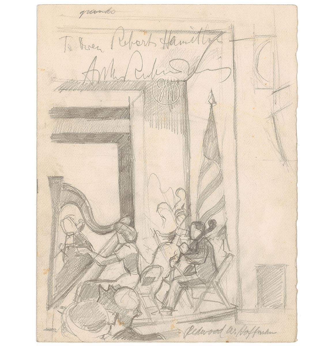 Pencil sketch of an orchestral performance drawn by an artist inside the back cover of a program for a performance by the Philadelphia Orchestra, four pages, 8.5 x 11 sheet, April 5, 1950, signed and inscribed at the top by the pianist, “To Owen Roberts Hamilton, Arthur Rubinstein.” Also signed in the lower right corner by the artist, “Redwood W. Hoffman.” In fine condition, with some light soiling. The recipient was the grandson of Supreme Court Associate Justice Owen J. Roberts, whose wife’s name is listed in the program as a member of the concert committee.