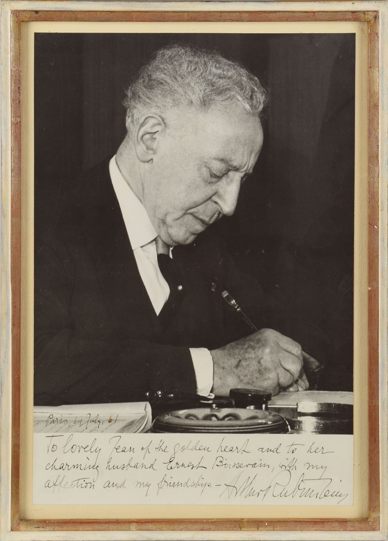 Imposing matte-finish 10.25 x 15.25 photo of Rubinstein at his desk, signed and inscribed in fountain pen, "Paris, 19 July, 61, To lovely Jean of the golden heart and to her charming husband Ernest Boissevain, with my affection and my friendship—Arthur Rubinstein.” Mounted and framed to an overall size of 12.5 x 17.5. In fine condition. Jean Tennyson was an operatic soprano and noted patron of the arts.