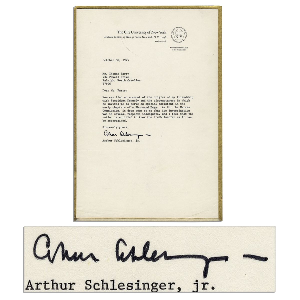 Arthur Schlesinger typed letter signed. The Pulitzer Prize-winner's letter to one Thomas Parry in North Carolina is dated 30 October 1975. Upon City University of New York stationery, it reads in full, ''Dear Mr. Parry: You can find an account of the origins of my friendship with President Kennedy and the circumstances in which he invited me to serve as special assistant in the early chapters of 'A Thousand Days'. As for the Warren Commission, it does seem to me that its investigation was in several respects inadequate, and I feel that the nation is entitled to know the truth insofar as it can be ascertained. Sincerely yours, [signed] Arthur Schlesinger''. Single-page letter is mounted and measures 7.25'' x 10.5''. Red pen streak near letterhead and crease to lower right, else near fine.