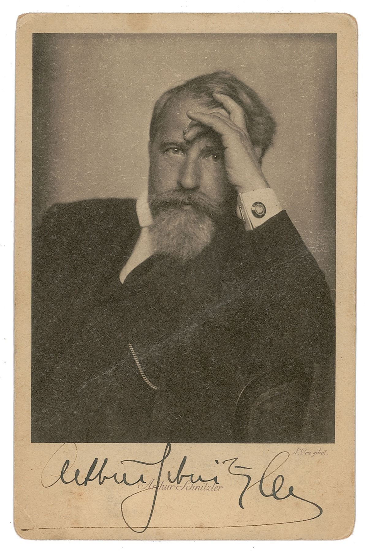 Uncommon 3.5 x 5.5 postcard photo of Schnitzler, signed in the lower border in ink. Addressed on the reverse in another hand. In fine condition, with some light scuffing to the image.