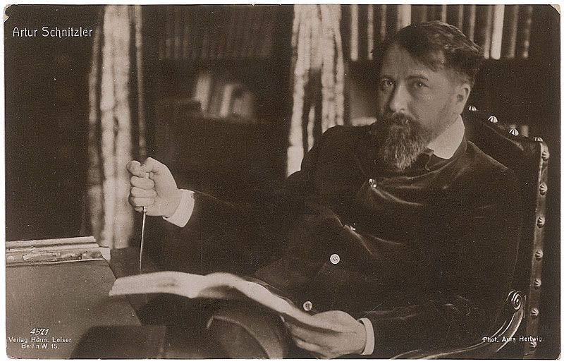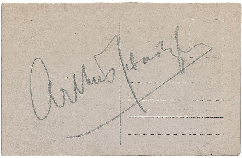 Austrian writer (1862–1931) best known for his sexually charged plays and stories. His 1926 novella Traumnovelle served as the basis for Eyes Wide Shut, the final film directed by Stanley Kubrick. Uncommon matte-finish 5.25 x 3.25 postcard photo of Schnitzler in his study, signed on the reverse in pencil. In fine condition.