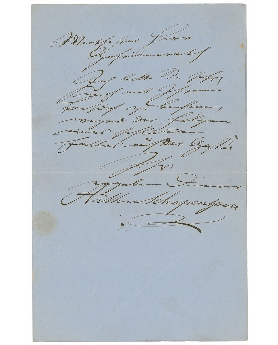 Important and highly influential German philosopher (1788–1860) best known for his often pessimistic works exploring the nature of reality, will, and desire. ALS in German, one page, 5.5 x 8.75, no date but circa 1860. Letter to his family physician Salomon Friedrich Stiebel, requesting a visit after a nasty spill. In part (translated): “I beg you to honor me with your visit, because of the consequences of a bad fall in the street.” Also addressed on the reverse of the second integral page in Schopenhauer’s own hand. In fine condition, with light creases and small areas of toning to left edge from adhesive remnants to reverse. Although quite healthy throughout his life, Schopenhauer’s health began to rapidly deteriorate in 1860 and he passed away from heart failure on September 21, 1860. A beautifully penned and quite rare piece of correspondence written by the great philosopher to his medical advisor.