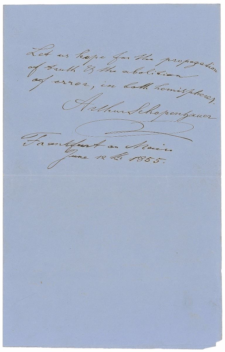 Important and highly influential German philosopher (1788–1860) best known for his often pessimistic works exploring the nature of reality, will, and desire. Exceptional AQS on a light blue 5.5 x 8.75 sheet, signed at the conclusion, “Arthur Schopenhauer, Frankfurt am Main, June 12th 1855.” Schopenhauer pens an optimistic philosophical quote. In full: “Let us hope for the propagation of truth & the abolition of error, in both hemispheres.” In fine condition, with a horizontal fold below all writing and a few light wrinkles. An extraordinarily influential philosopher, Schopenhauer’s ideas resonated with such diverse scientific and cultural figures as Charles Darwin, Gustav Mahler, Albert Einstein, and Dylan Thomas. A highly sought-after example of the German philosopher, who remains extremely scarce in autographic material.