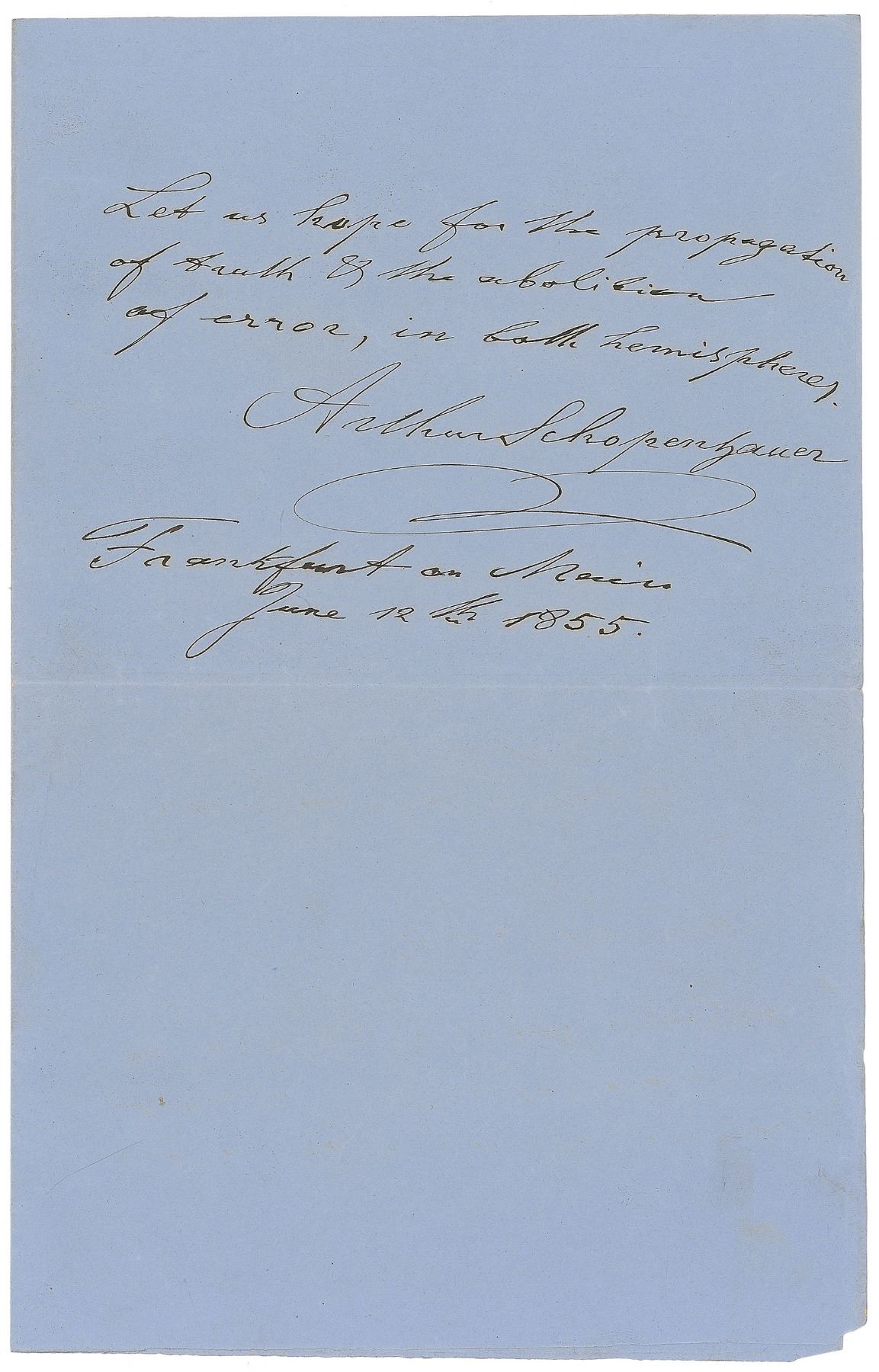 Important and highly influential German philosopher (1788–1860) best known for his often pessimistic works exploring the nature of reality, will, and desire. Exceptional AQS on a light blue 5.5 x 8.75 sheet, signed at the conclusion, "Arthur Schopenhauer, Frankfurt am Main, June 12th 1855." Schopenhauer pens an optimistic philosophical quote. In full: "Let us hope for the propagation of truth & the abolition of error, in both hemispheres." In fine condition, with a horizontal fold below all writing and a few light wrinkles. An extraordinarily influential philosopher, Schopenhauer's ideas resonated with such diverse scientific and cultural figures as Charles Darwin, Gustav Mahler, Albert Einstein, and Dylan Thomas. A highly sought-after example of the German philosopher, who remains extremely scarce in autographic material.