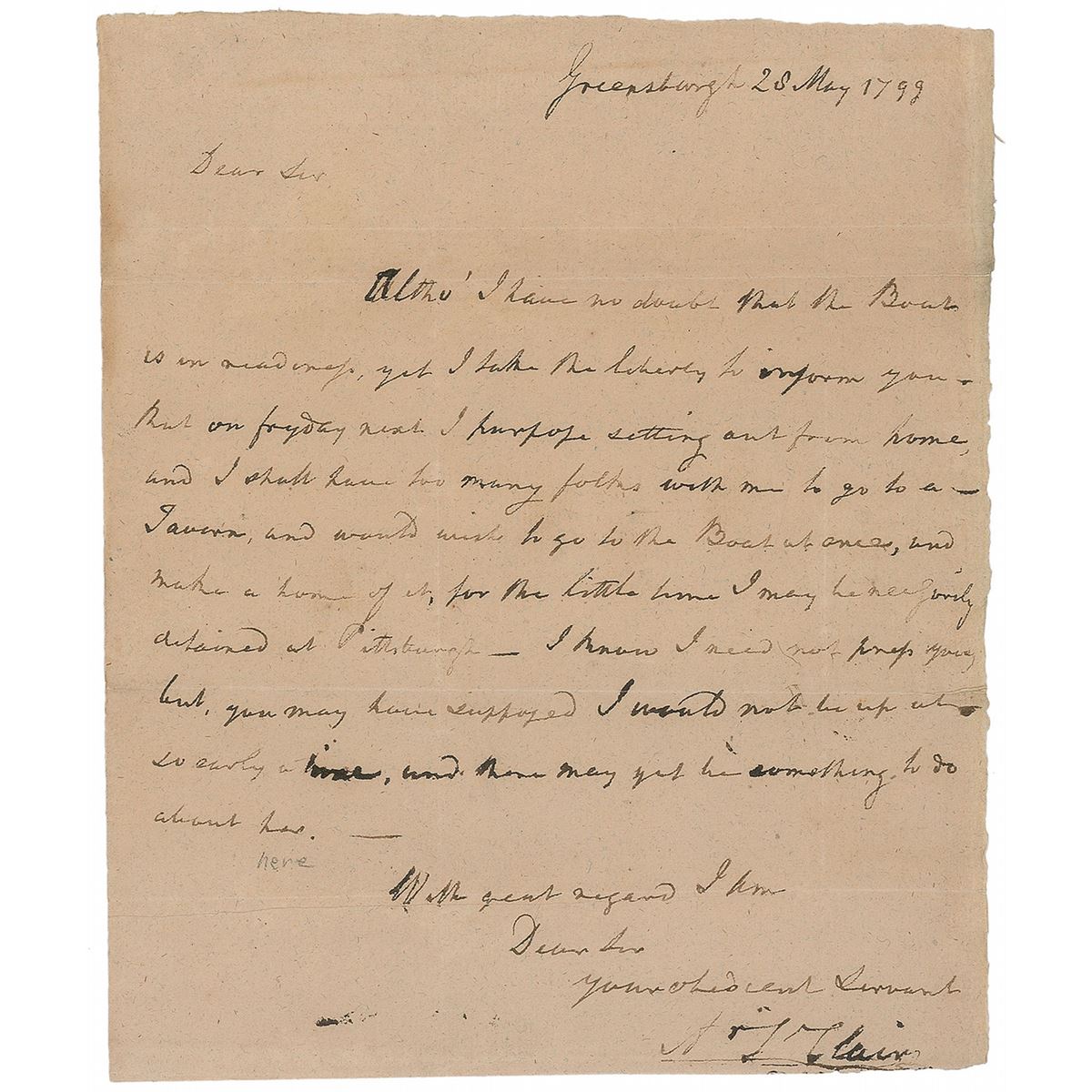 American soldier and politician (1737-1818) who rose to the rank of major general in the Continental Army during the American Revolution but lost his command after a controversial retreat from Fort Ticonderoga. ALS signed “Ar. St. Clair,” one page, 6.75 x 8, May 28, 1799. Letter to a gentleman. In part: “Altho’ I have no doubt that the Boay is in readiness, yet I take the liberty to inform you that on fryday [sic] next I purpose setting out from home, and I shall have too many folks with me to go to a Tavern, and would wish to go to the Boat at once, and make a home of it, for the little time I may be necessarily detained at Pittsburgh.” Intersecting folds, overall toning, and some of the writing a shade or two light, otherwise fine condition.
