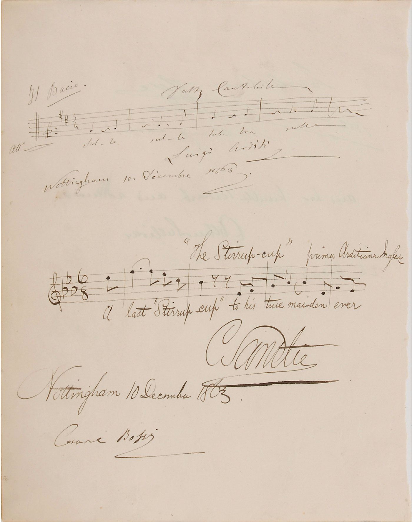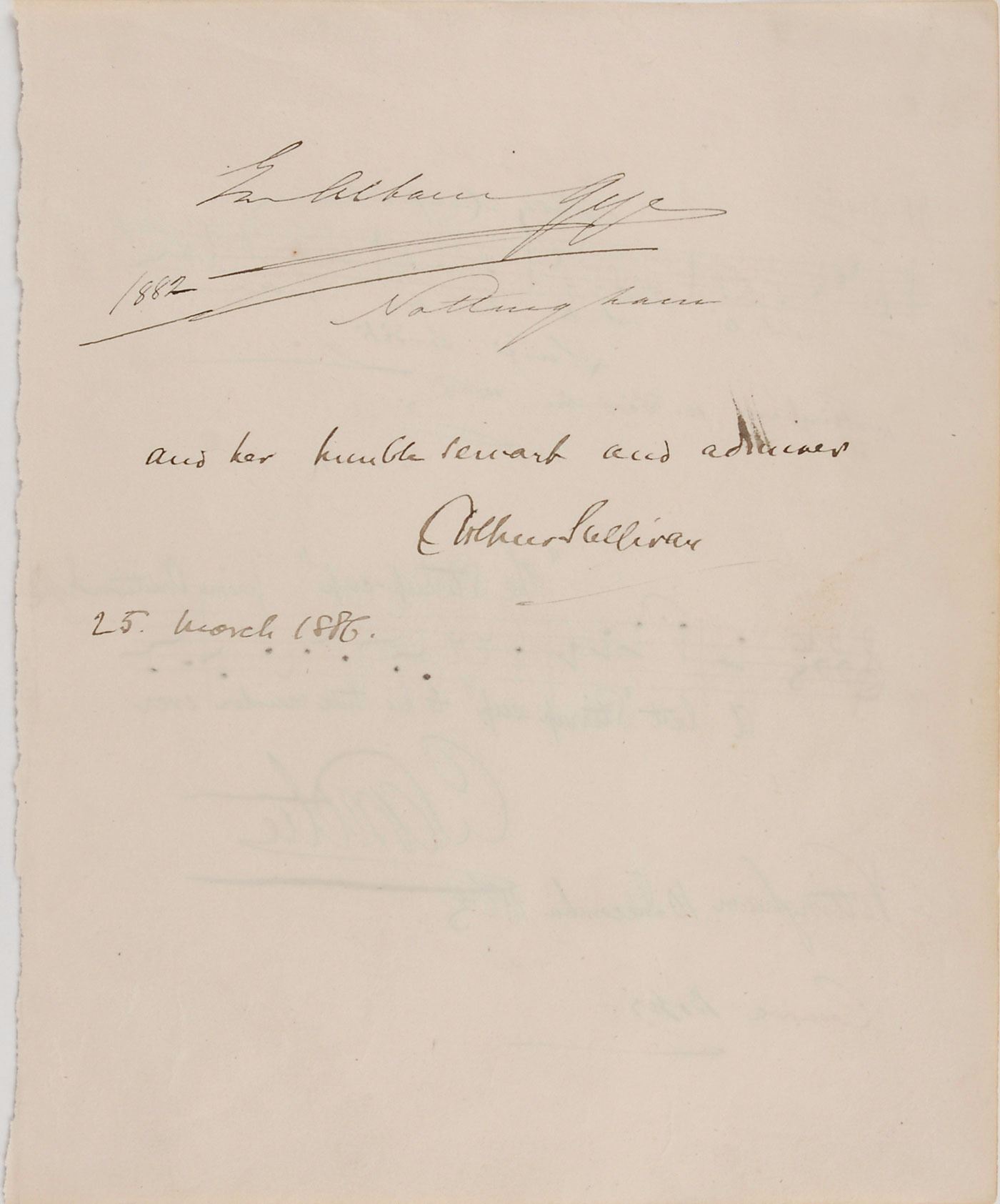 Ink signatures, "E. Albani Gee, 1882, Nottingham" and "and her humble servant and admirer, Arthur Sullivan, 25 March 1886," on an off-white 6.75 x 8.75 album page. Also bears AMQSs on the reverse by Italian violinist Luigi Arditi and eminent English baritone Charles Santley. In fine condition.