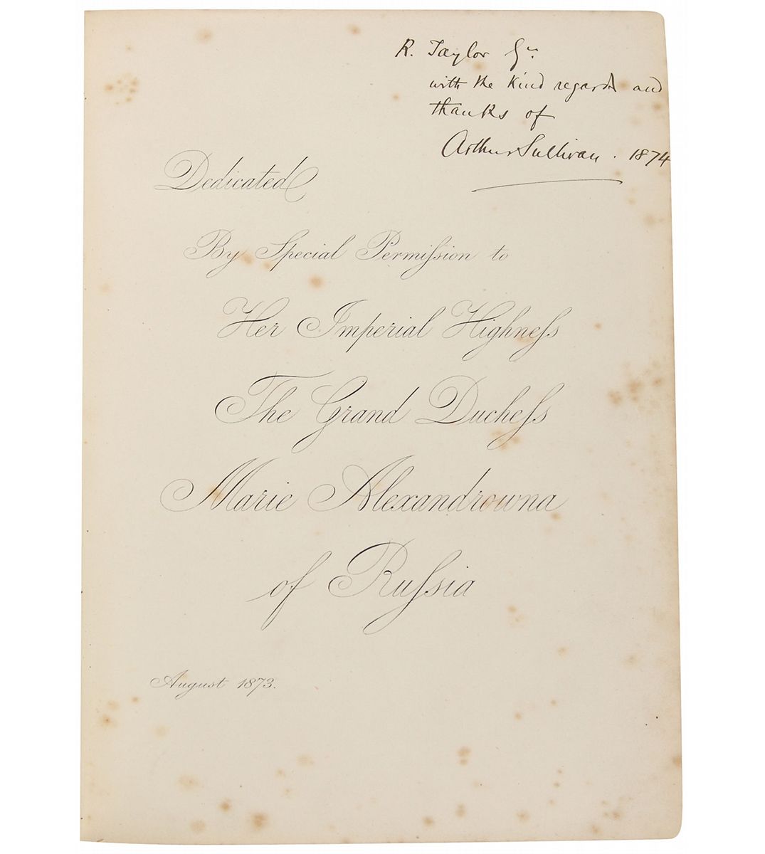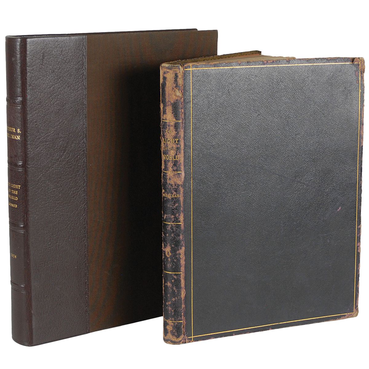 British composer (1842–1900) best known for his collaborations on more than a dozen classic comic operas with librettist W. S. Gilbert. Signed book: the score for The Light of the World. London: J. B. Cramer & Co., 1873. Leatherbound hardcover, 8 x 10.5, 275 pages. Signed and inscribed on the dedication page in black ink, “To R. Taylor, Jr., with the kind regards and thanks of Arthur Sullivan, 1874.” In very good condition, with moderate to heavy foxing to signed page and throughout the score, and significant marks, chips, and cracks to the leather cover. Accompanied by an attractive custom-made clamshell presentation case.