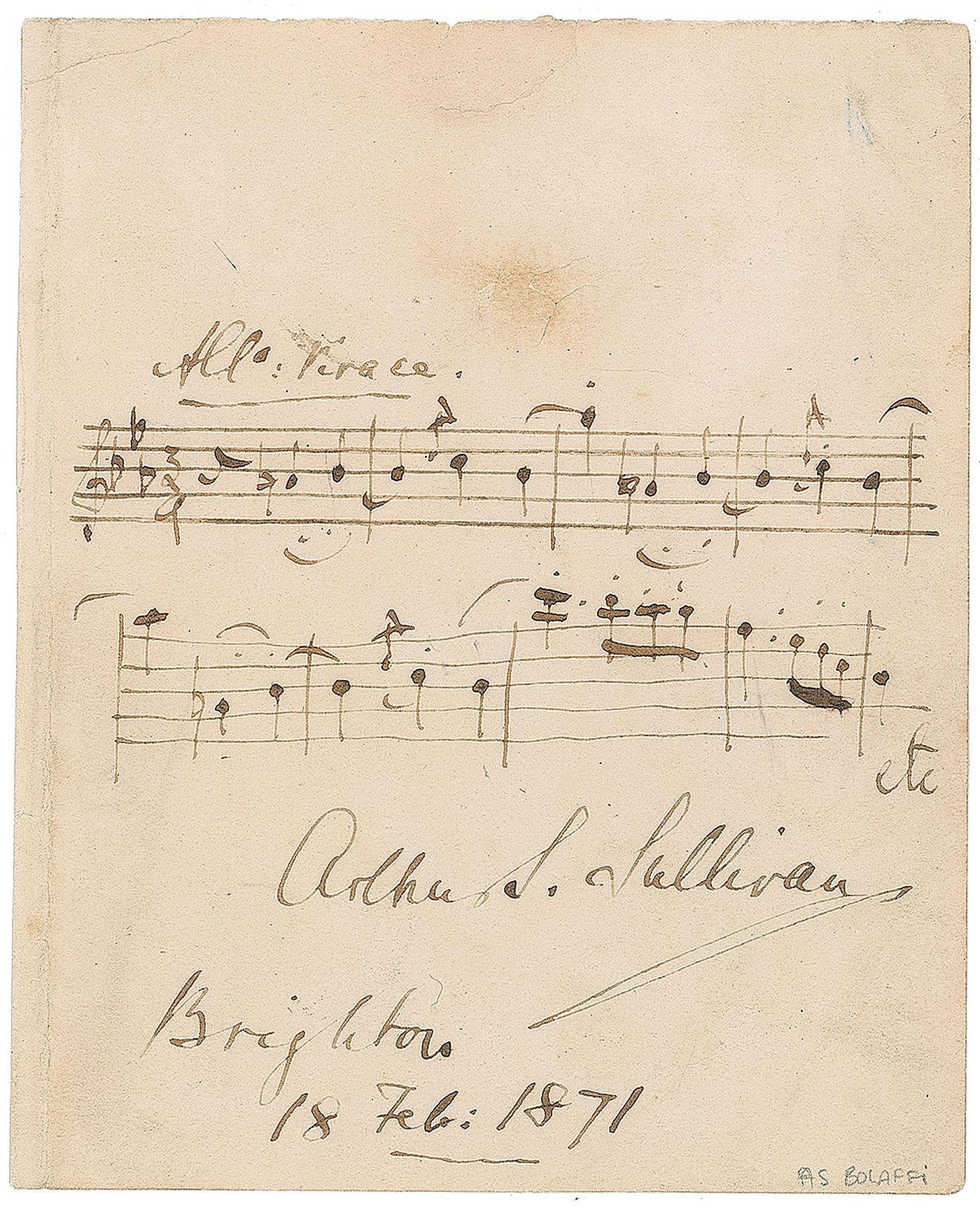 English composer (1842–1900) best known for his operatic collaborations with W. S. Gilbert, including H.M.S. Pinafore, The Pirates of Penzance, and The Mikado. AMQS on an off-white 3.5 x 4.5 sheet, signed below in black ink, "Arthur S. Sullivan, Brighton, 18 Feb. 1871." Sullivan pens eight bars of music from one of his works, marking the tempo, "Alla vivace." In fine condition, with some light toning.