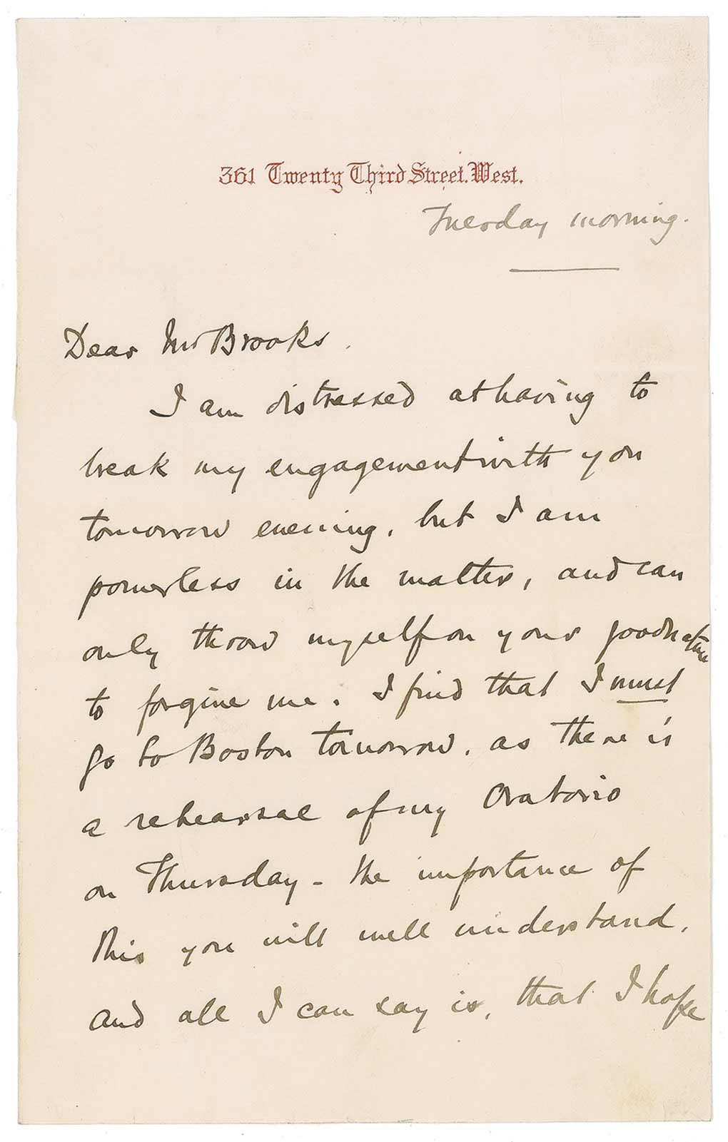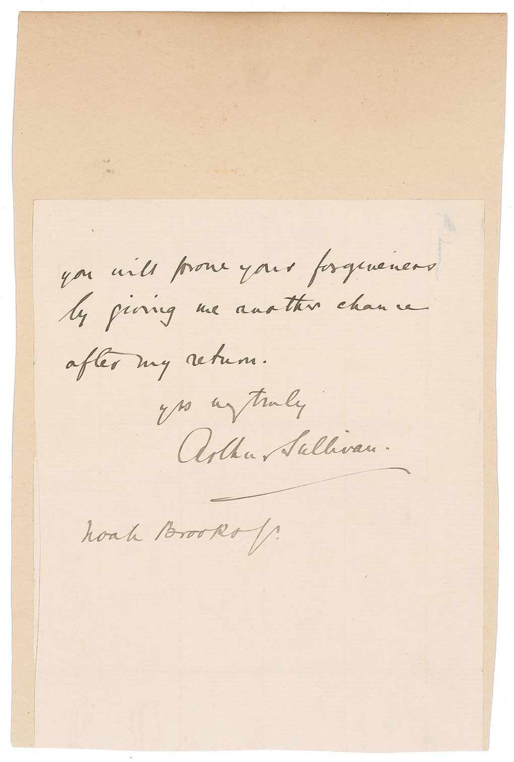 British composer (1842–1900) best known for his collaborations on more than a dozen classic comic operas with librettist W. S. Gilbert. ALS, two pages, 5 x 8, personal letterhead, no date. Letter to Noah Brooks canceling an engagement. In part: “I am distressed at having to break my engagement with you tomorrow evening, but I am powerless in the matter…I find that I must go to Boston tomorrow as there is a rehearsal of my Oratorio…the importance of this you will understand.” Originally from the collection of Noah Brooks. Brooks was a journalist and editor who worked for newspapers in Sacramento, San Francisco, Newark, and New York, and authored a major biography of Abraham Lincoln based on close personal observation. Brooks was also set to be appointed Lincoln’s private secretary but that was aborted after his assassination. In fine condition, with second page trimmed to 5 x 6.25 and affixed to a slightly larger album page, and some light toning.