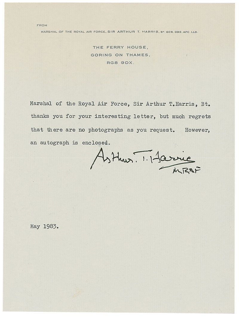 Marshal of the Royal Air Force (1892–1984), aka “Bomber” Harris, best known for his command of devastatingly effective British bombing efforts during World War II. Third-person TLS signed “Arthur T. Harris MRAF,” one page, 6 x 8, The Ferry House letterhead, May 1983. Letter reads, in full: “Marshal of the Royal Air Force, Sir Arthur T. Harris, Bt. thanks you for your interesting letter, but much regrets that there are no photographs as you request. However, an autograph is enclosed.” In fine condition.