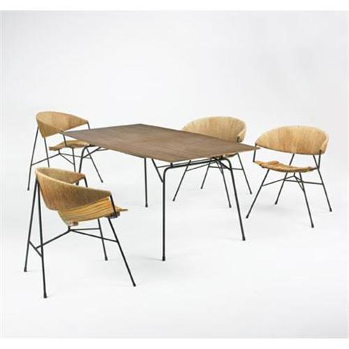 Sold with one 12-inch leaf; table measures seventy-two inches when fully extended.<BR><BR>Condition: Chair seats and backs show significant wear from age and use with loss of finish, scratches and discoloration the wooden seat,s and soiling/patina to the rush backrests. Tabletop has spot areas of wear with minor surface scratches consistent with use. Frames of both table and chairs have minor flake losses and spot areas of surface corrosion concentrated near the feet. Overall good vintage condition.