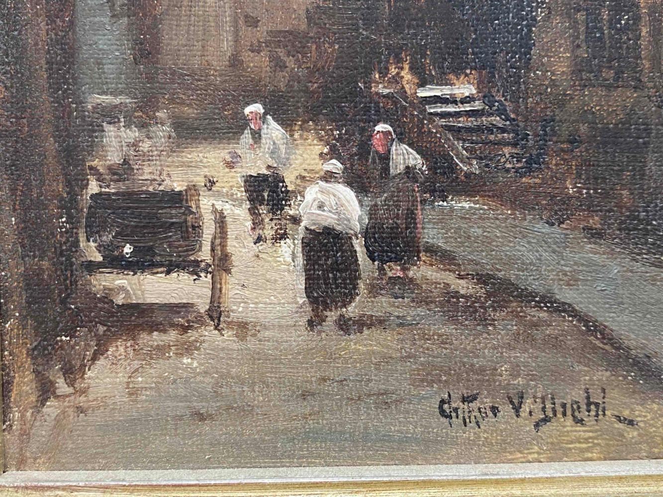 Oil On Canvas European Village Scene. Approximately 10.75 x 8.75W in. Sight Approximately 5.5L x 3.5W in.