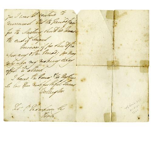 <B>Arthur Wellesley, Duke of Wellington Autograph Letter Signed</B></I> "<I>Wellington</B></I>". Two pages, 4.75" x 7.25", Westfield, January 26, 1839, to Thomas P Thompson of Dover. A reply to a request for a dining engagement, in part, "<I>...You are aware however that I am much engaged in the affairs of Parl[iamen]t; and in order to render it certain that I shall be able to attend I would venture...</B></I>" Good condition; foxing and old tape repairs to folds where separating. Also included is a period engraving of Wellington. From the Henry E. Luhrs Collection. Accompanied by LOA from PSA/DNA.