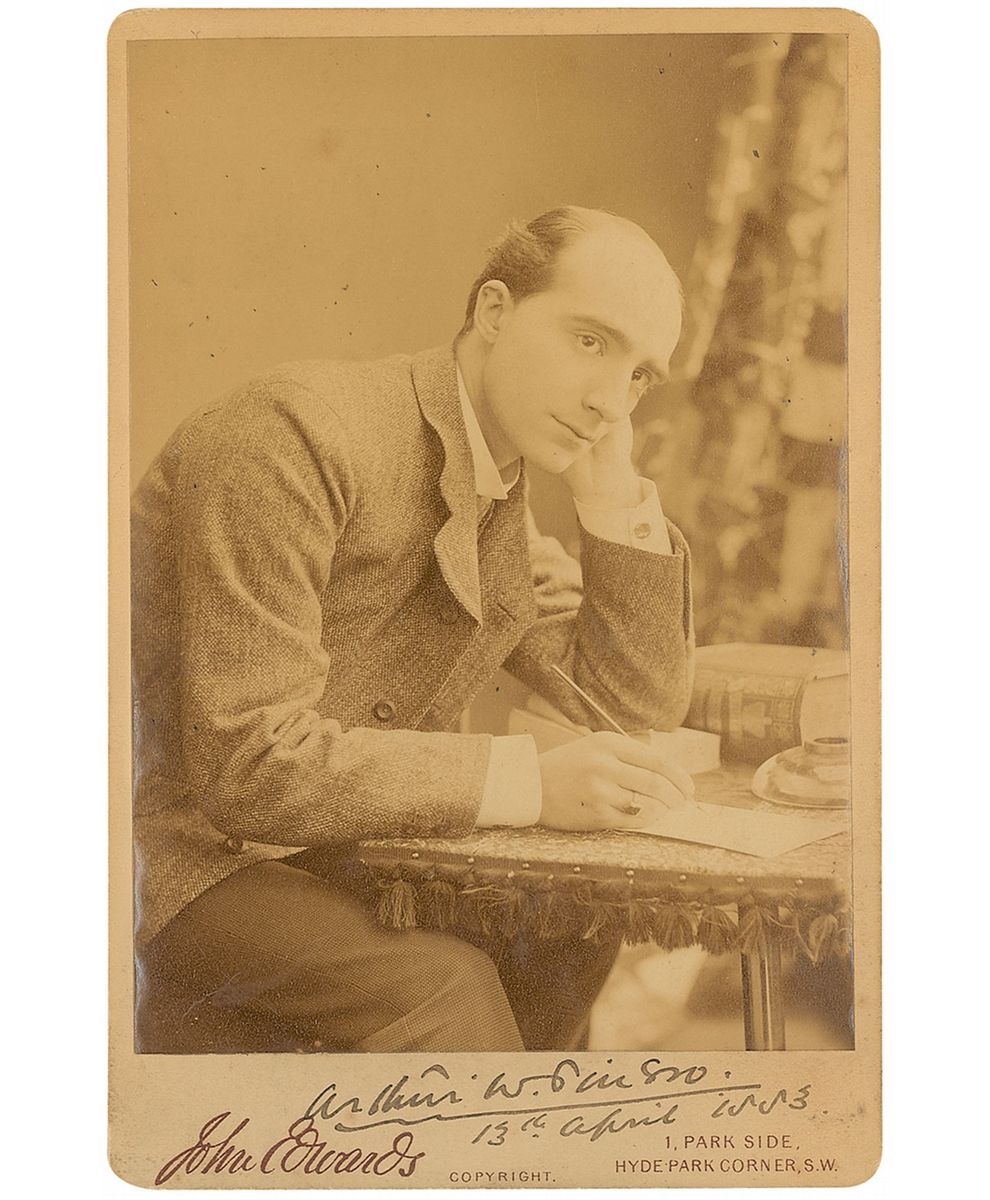 Important English actor, playwright, and director (1855–1934). Original 4.25 x 6.5 cabinet photo of Pinero writing at his desk by John Edwards of London, signed in the lower border in black ink, “Arthur W. Pinero, 13th April 1883.” In fine condition, with overall toning and silvering to dark areas of the image.