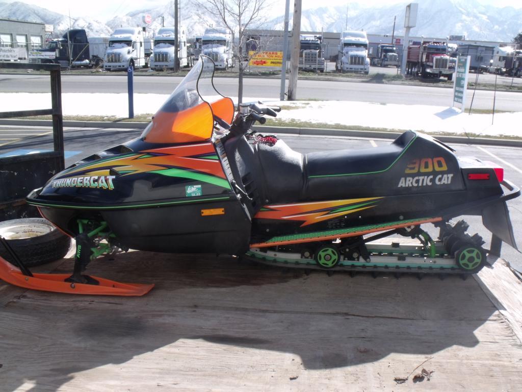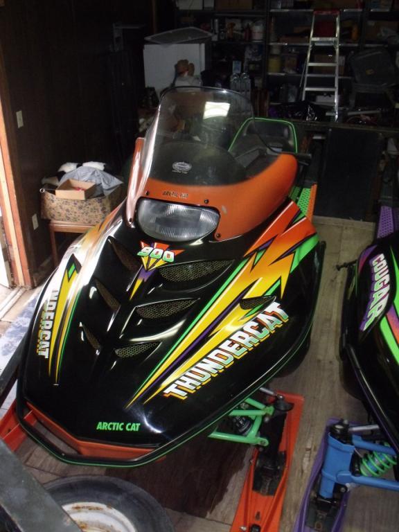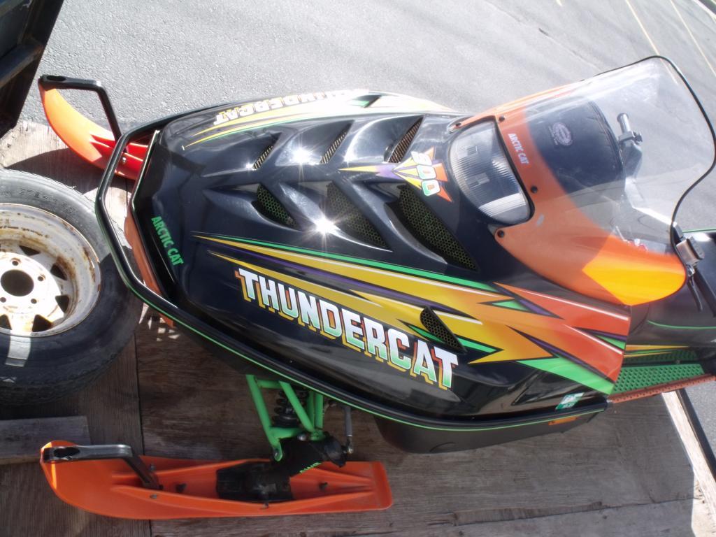 1996 Artic Cat Thundercat 900 snowmobile includes hill climber clutch, it has been piped has K&N filters and the mountain cat track package with 1.5" tall track. Has 2,853 miles. In orange, green, and black in good condition.