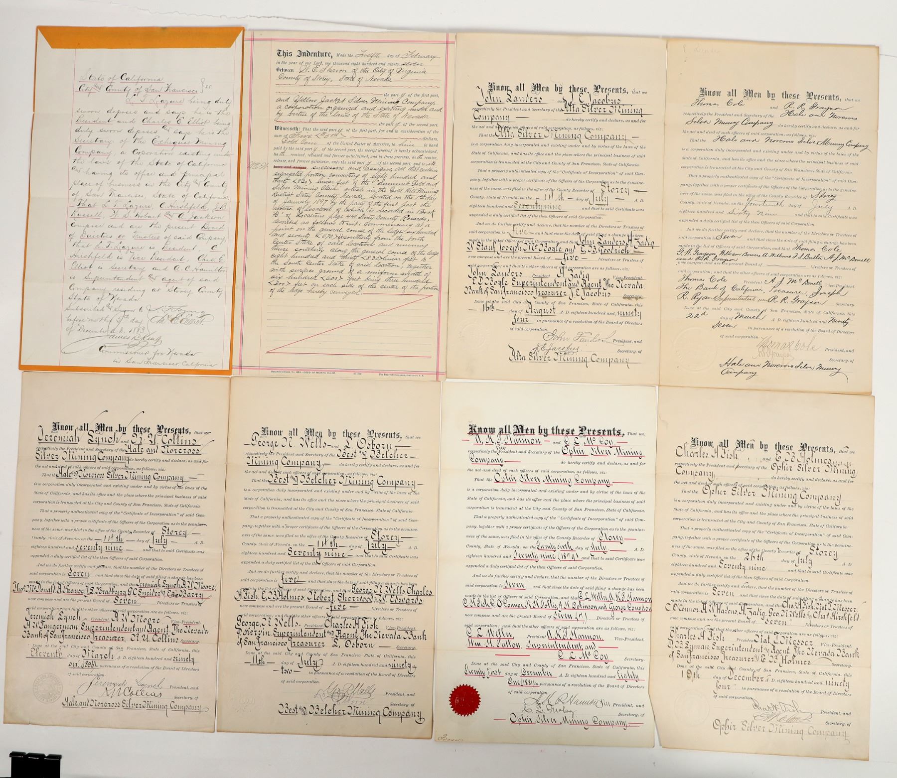 Lot of 8. Authenticated copies of Articles of Incorporation for: Ophir Silver MC (1881 and 1894); Hale & Norcross (1896 and 1897); Best & Belcher (1892); Alta (1894). Certified List of Officers for the Exchequer Mining Company (1883). 1897 indenture between WE Sharon (nephew of William Sharon) and the Yellow Jacket Silver Mining Company.