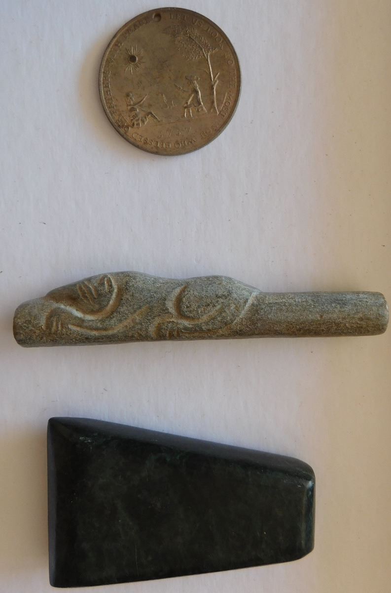 Artifact Collection, pre-historic items and peace medal from the 1700s. Lot contains jade and nickel silver, the pipe measures 5" and the celt measures 4". From Tabasco, Mexico. Pipe has an animal effigy, mayan jade celt has nice polish! Frame not included. Condition: Nice, see images. Shipping: $19.50.