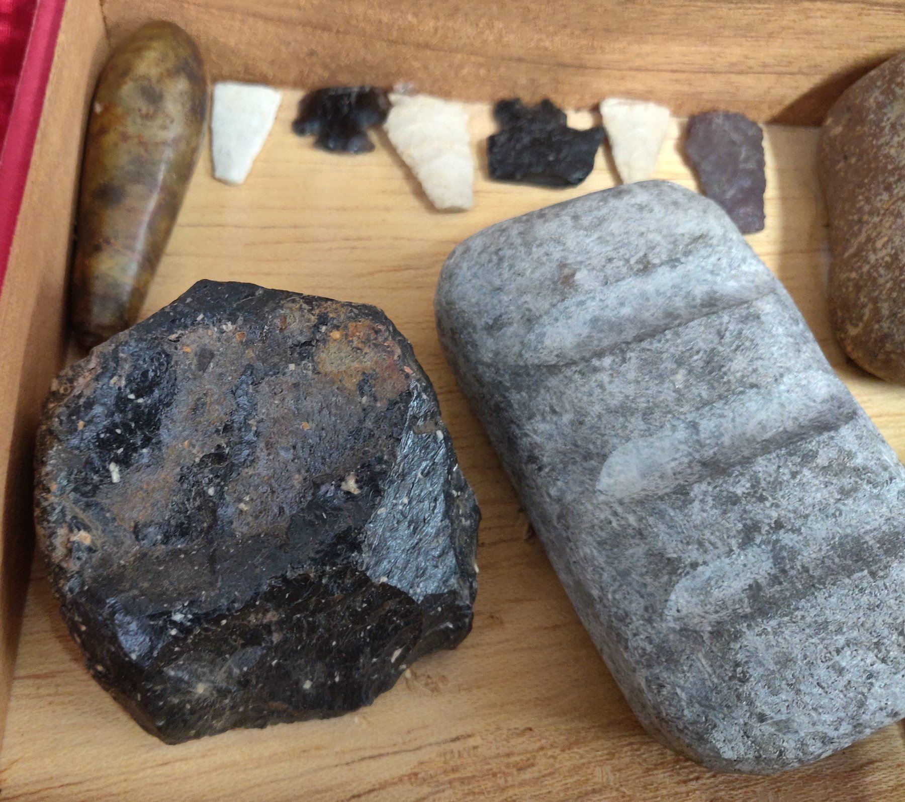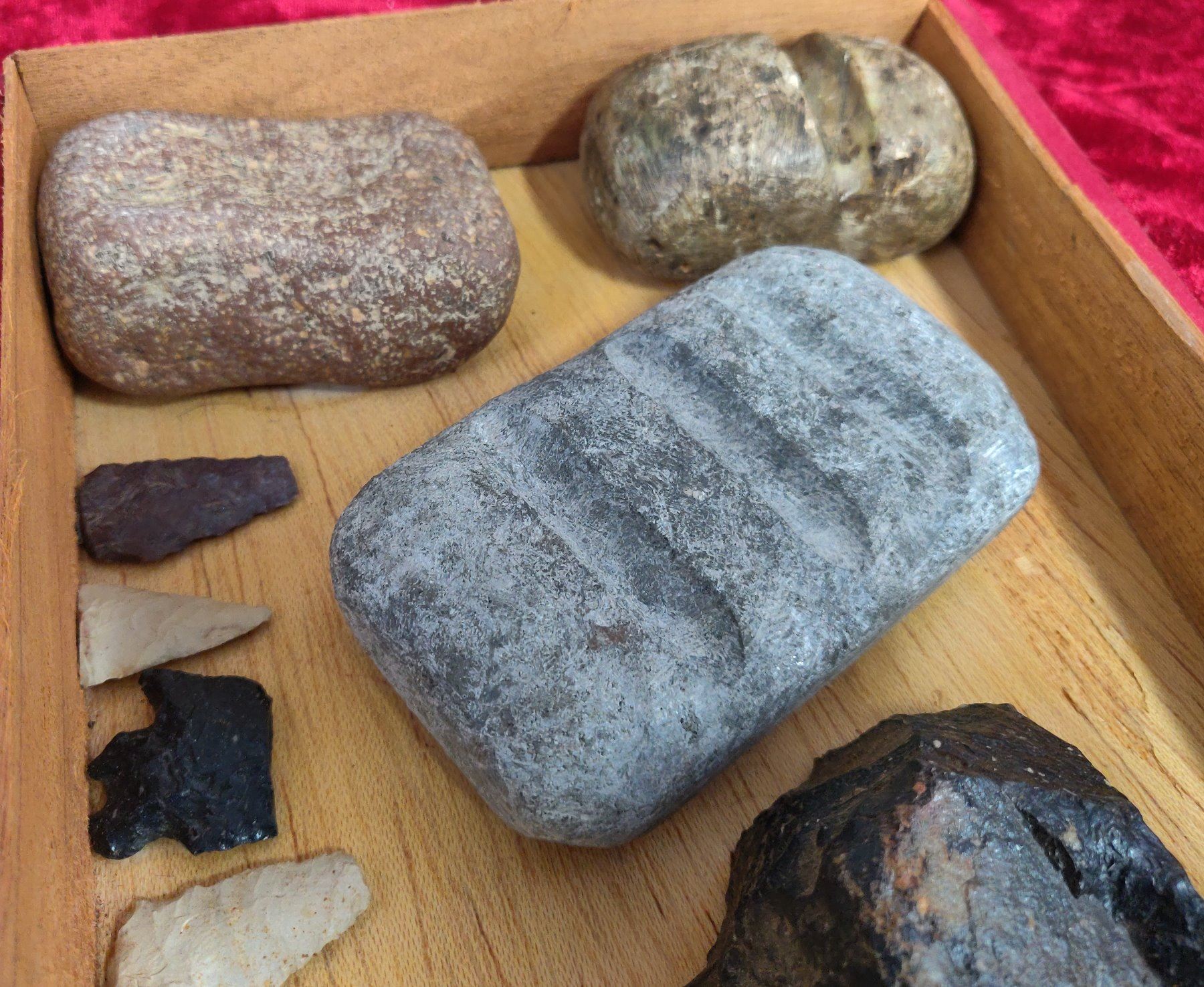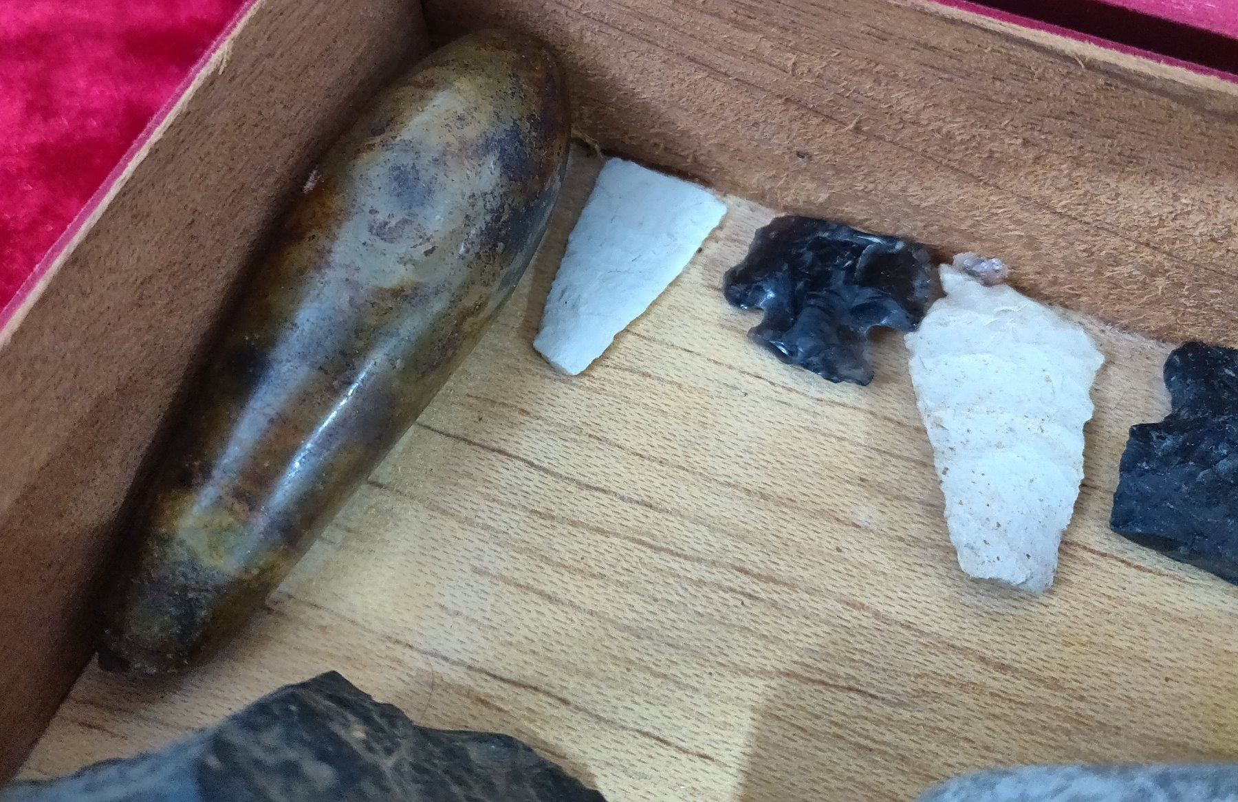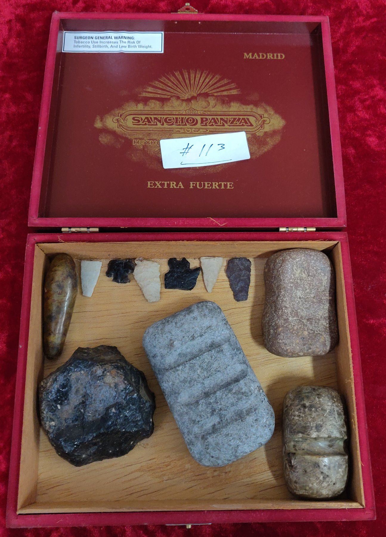 Artifact Collection, historic to archaic periods. Made of flint and steatite, the largest measures 4". Midwest. Cigar box included. Condition: Some damaged points, see images. Shipping: $26.50 w/insurance and signature, due to value and weight.
