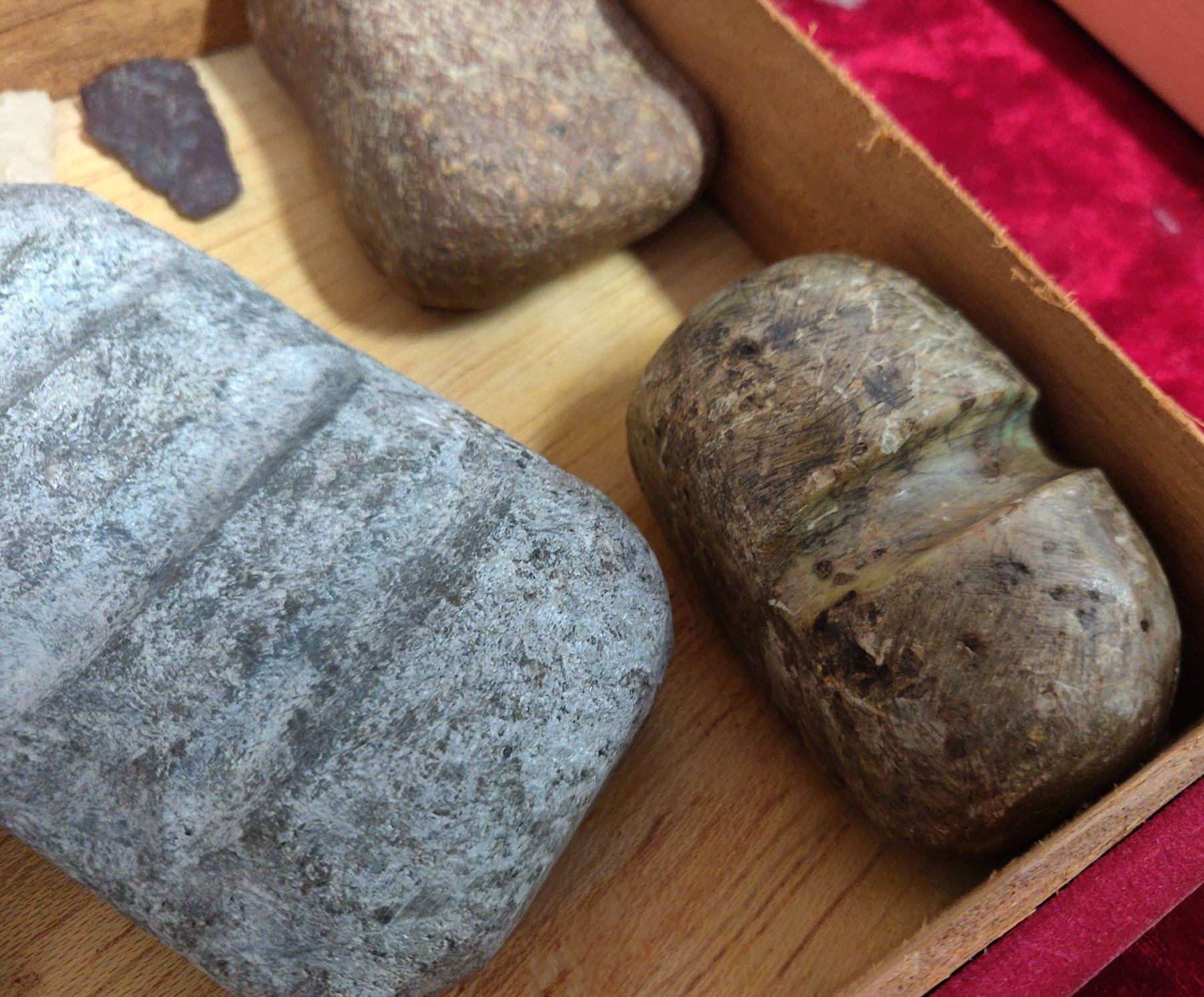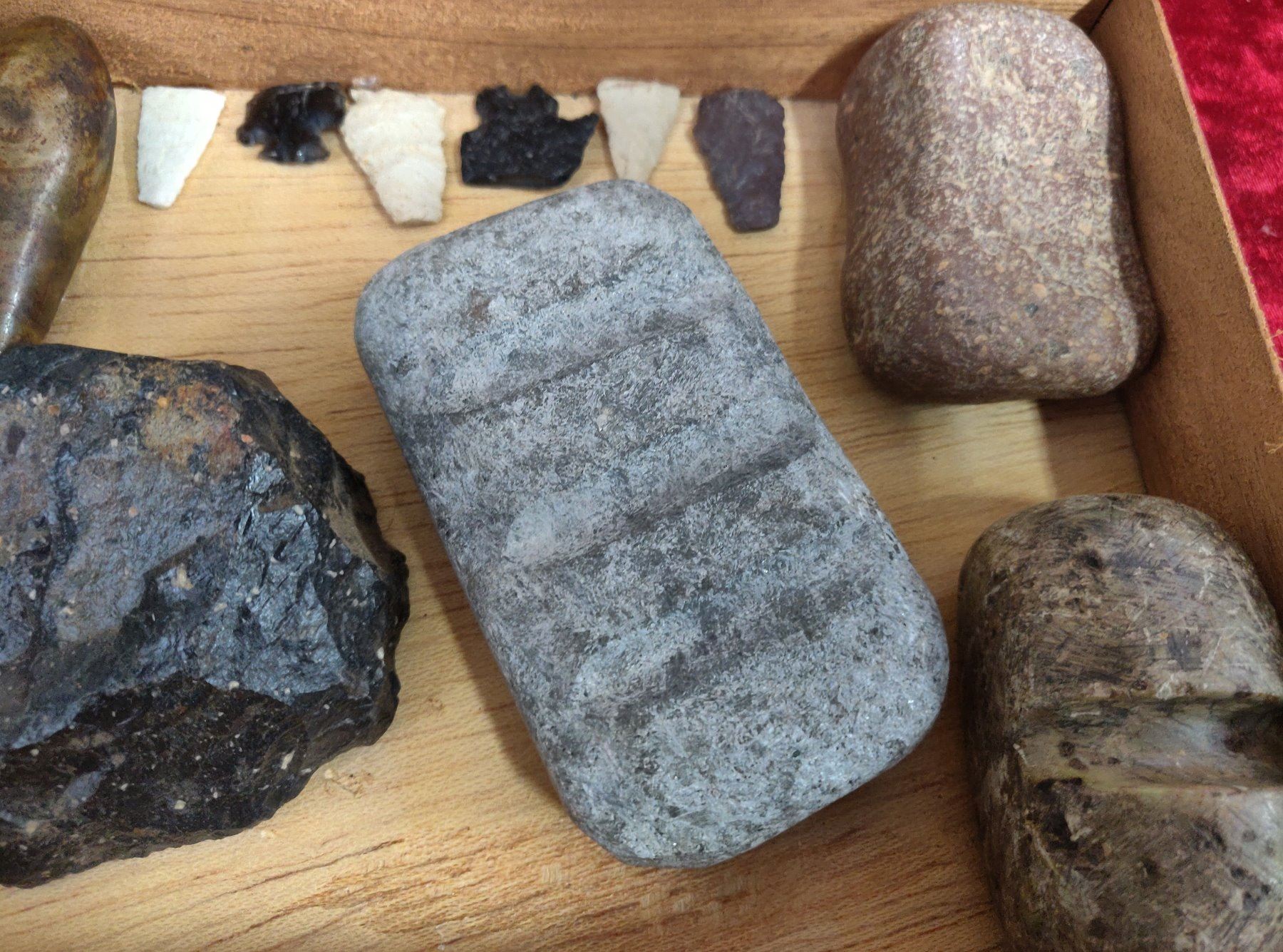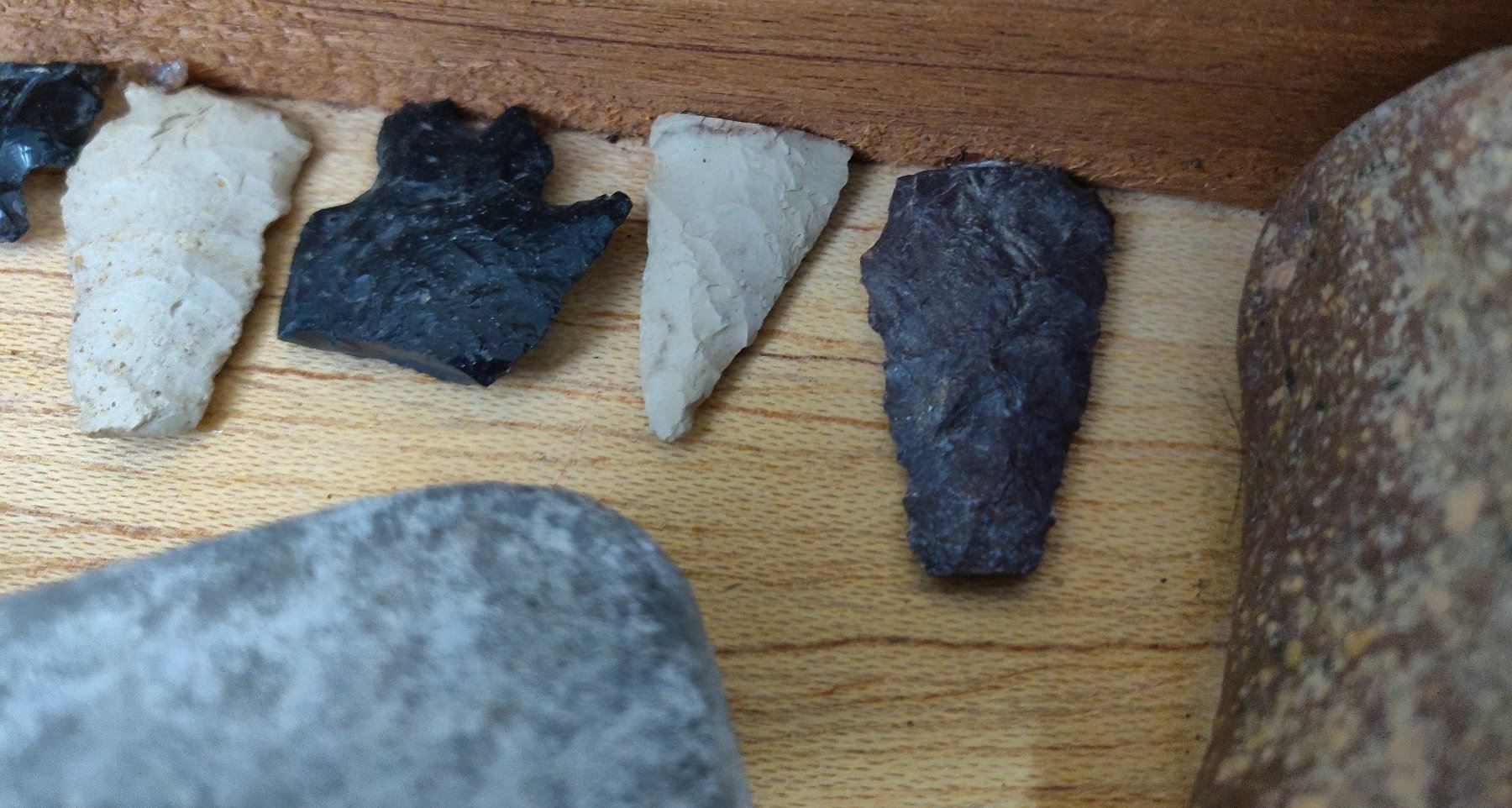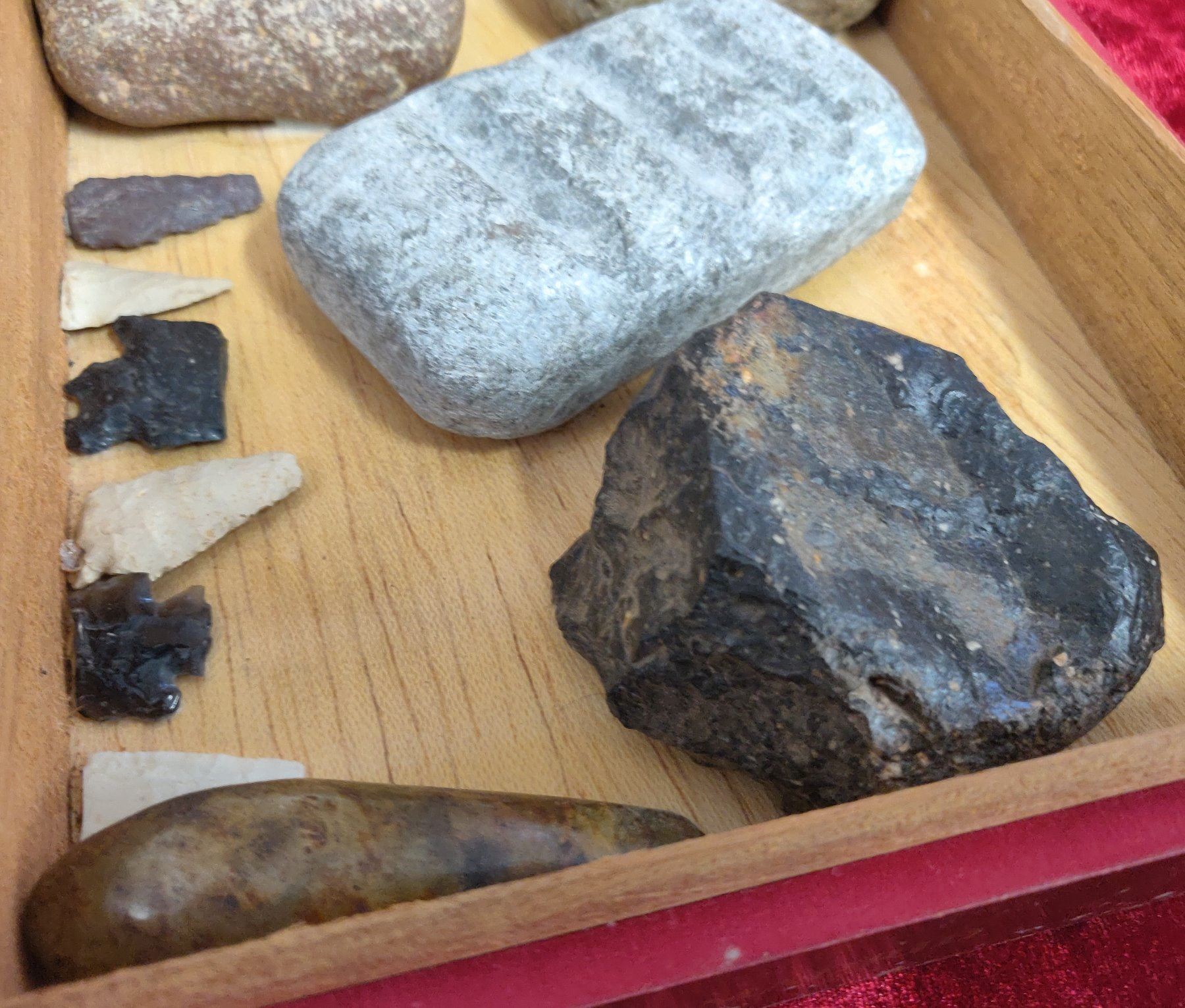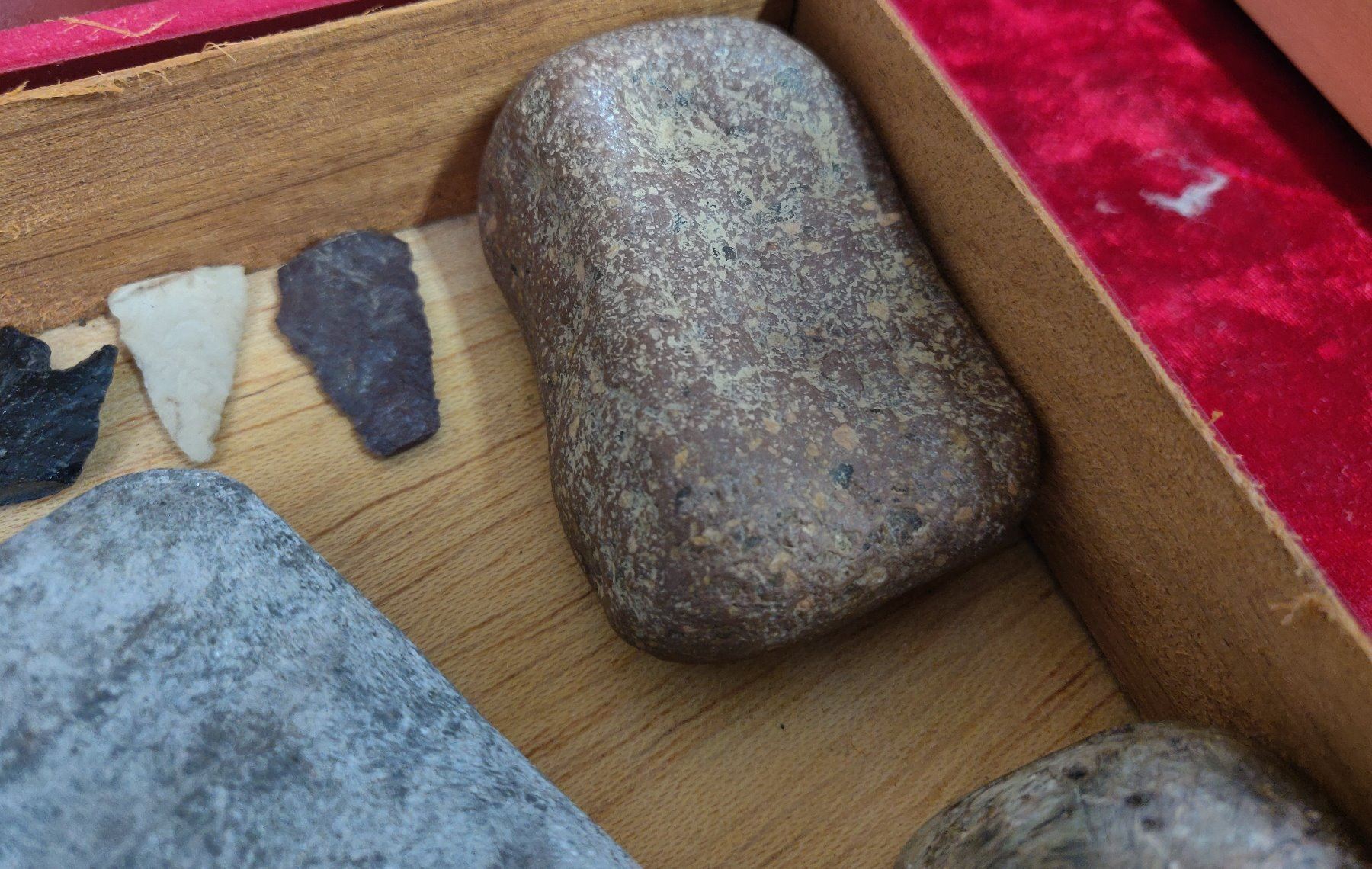 Artifact Collection, historic to archaic periods. Made of flint and steatite, the largest measures 4". Midwest. Cigar box included. Condition: Some damaged points, see images. Shipping: $26.50 w/insurance and signature, due to value and weight.